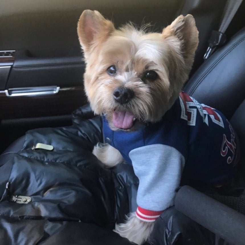 Her pooch, Hoodie, has made quite a splash recently on social with his outfits, some of which come from his mama’s famous friends.