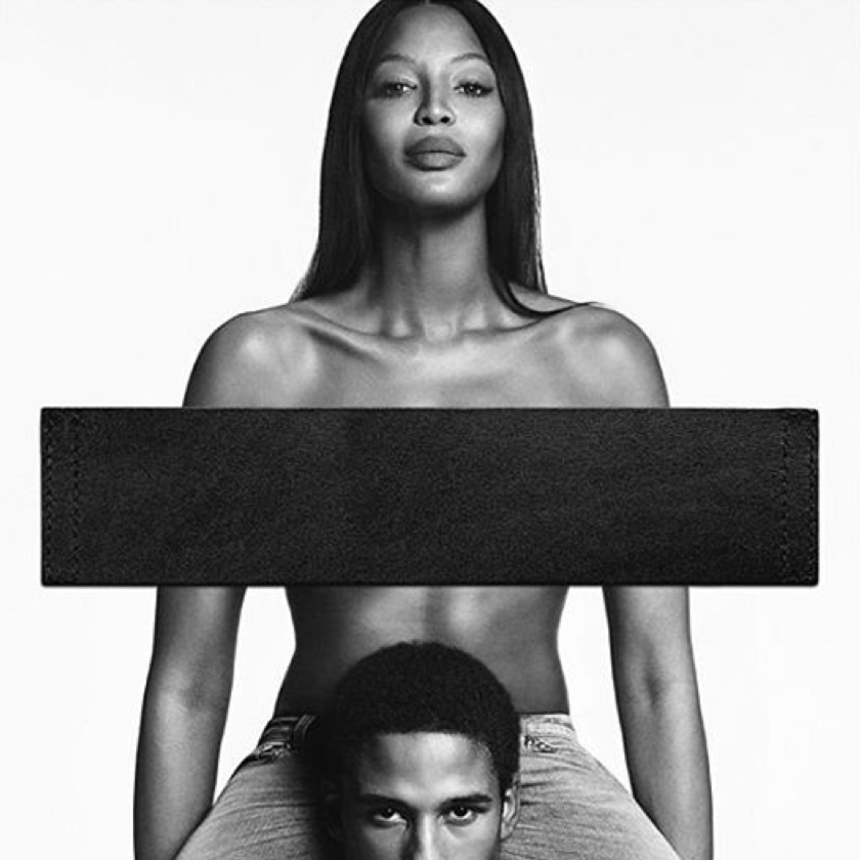 Perched topless on the shoulders of male model Justin Levy, Campbell shows us once again why she’s one of the most recognizable faces in the modeling industry.