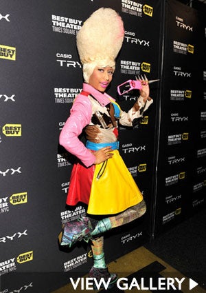 Who cares about being color coordinated when you’re Nicki Minaj? As we’ve come to expect, the rapper defied fashion expectations with her technicolor leather coat paired with graphic print tights and a platinum blonde bouffant wig at the TRYX Casio Camera Launch Party. Nicki is reportedly in talks to support Britney Spears on her Femme Fatale tour.