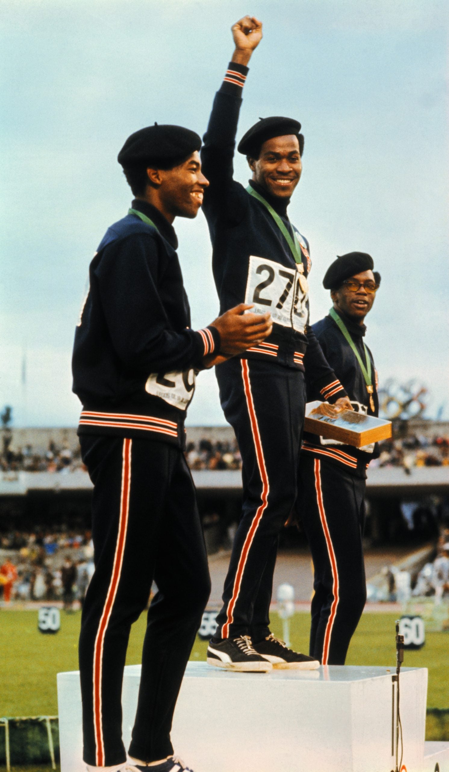 Lee Evans, center, raises his fist in solidarity with the Black Panther movement at the 1968 Olympics in Mexico City. He won two gold medals at the games (400 meter run and 1,600 meter relay). Evans died on May 26; he was 74.