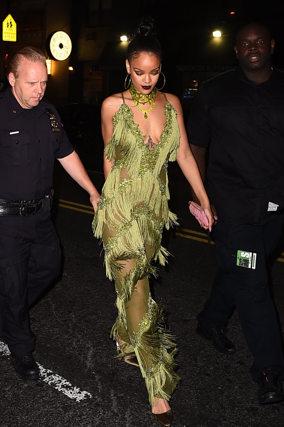 Rih stepped out drenched in a peek-a-boo Gucci frock.
