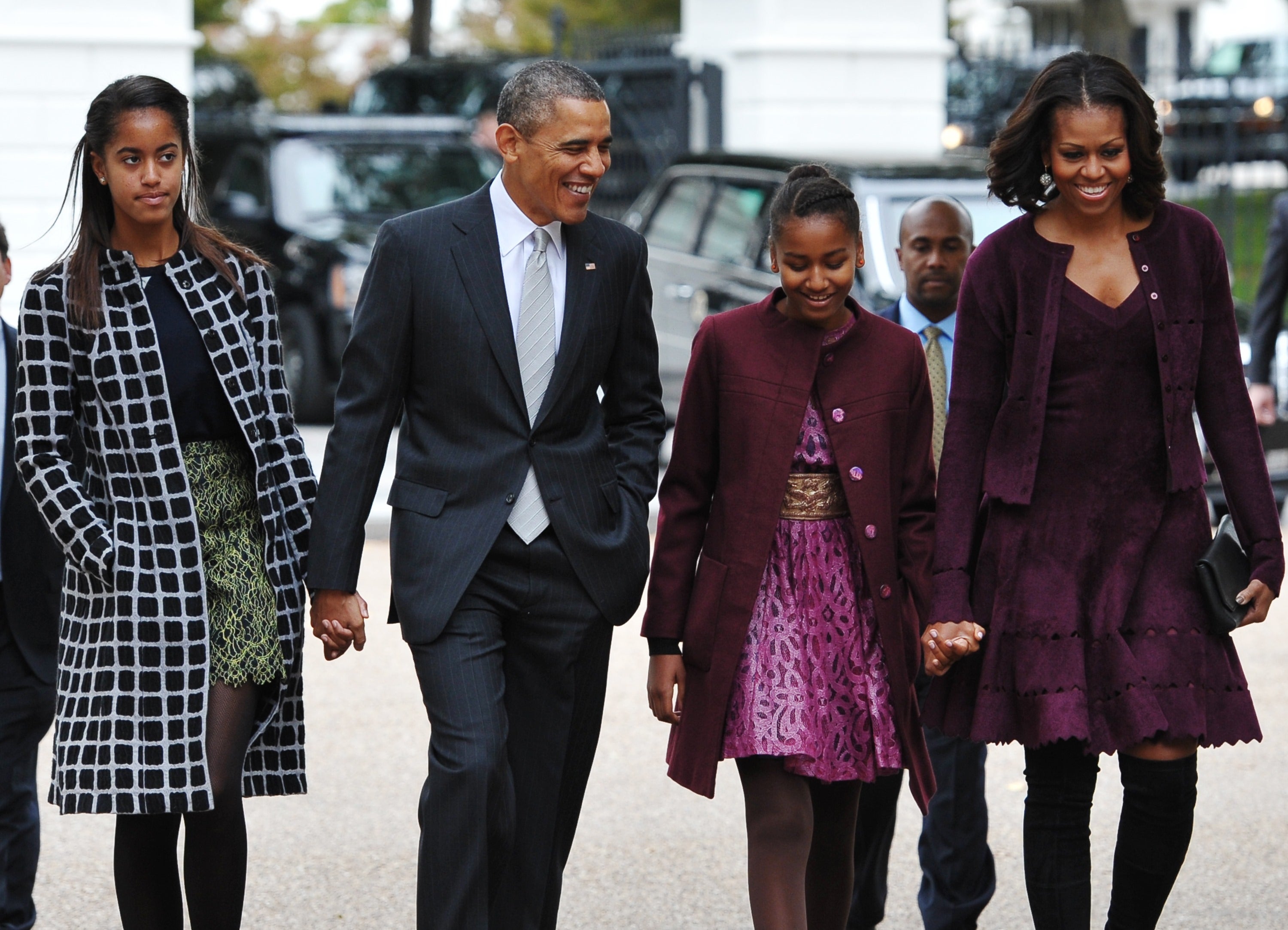 Sasha wears a flared purple coat and Malia wears a dark pink coat as they arrive for cermonies in which their father US President Barack Obama will take the oath of office during the 57th Presidential Inauguration ceremonial swearing-in at the US Capitol on January 21, 2013 in Washington, DC.