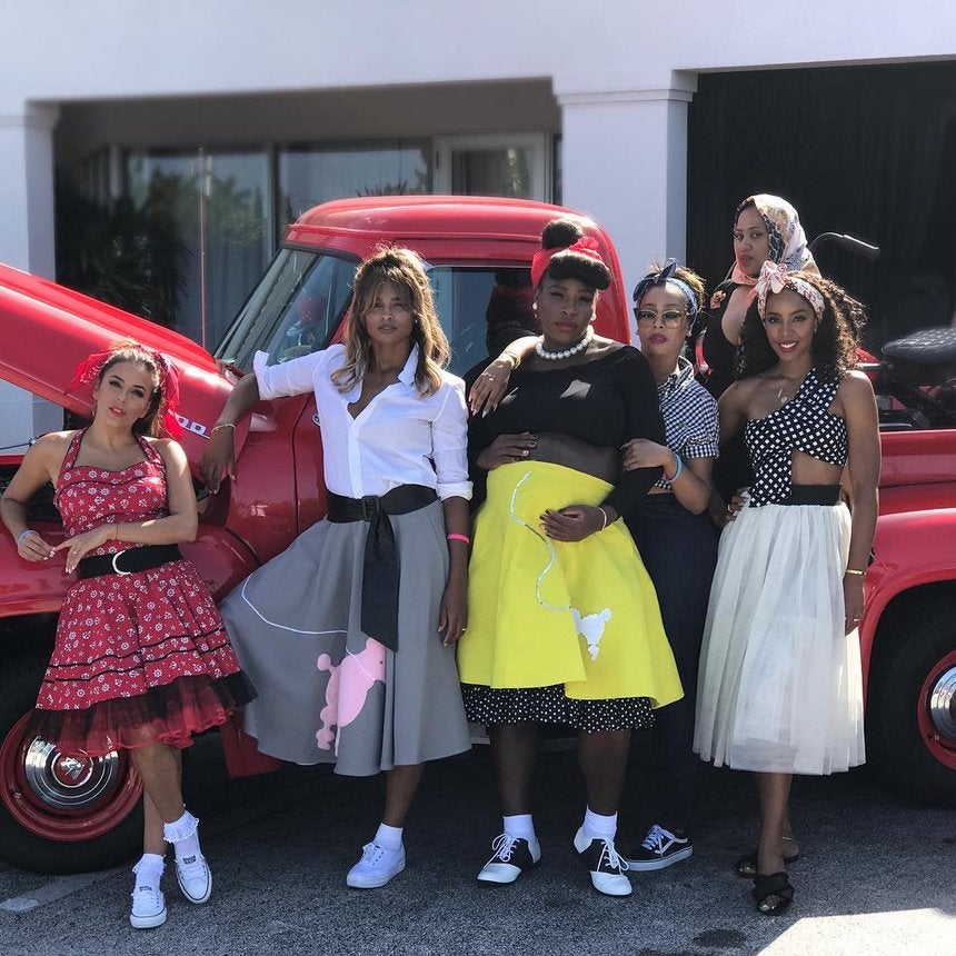 These ladies went all out for the ’50s theme. Williams opted for a sweet yellow poodle skirt and black long-sleeve top, which she paired with a string of pearls and a red headband. She cradled her growing baby bump as she and her friends posed for pics with a cherry red vintage pickup truck.
