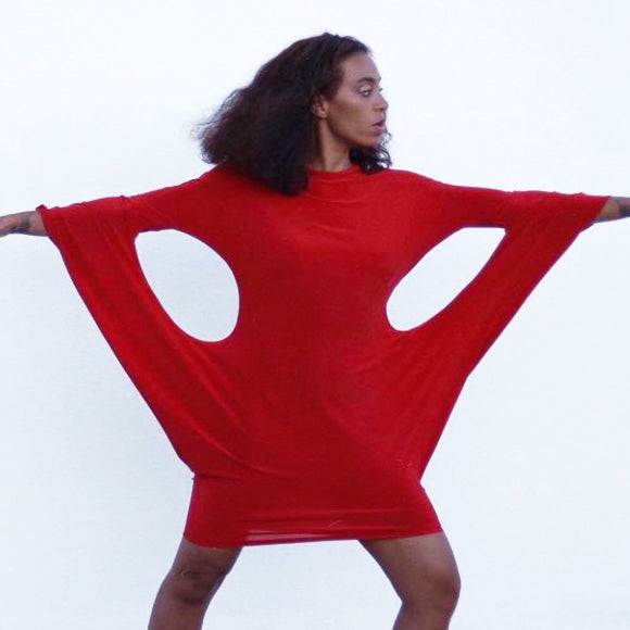 The striking red, body-hugging jumpsuits worn by Solange and her background singers (Isadora Mendez and Franchelle Lucas) were beautifully connected to one another by bands of fabric — creating a train of sarotiral splendor.