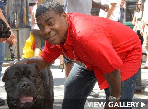 One of our favorite comedians, Tracy Morgan, brought along his beloved dog, Max, to the set of “30 Rock.” We wonder if he ever brings his pet python, piranhas and tiger eels on location.