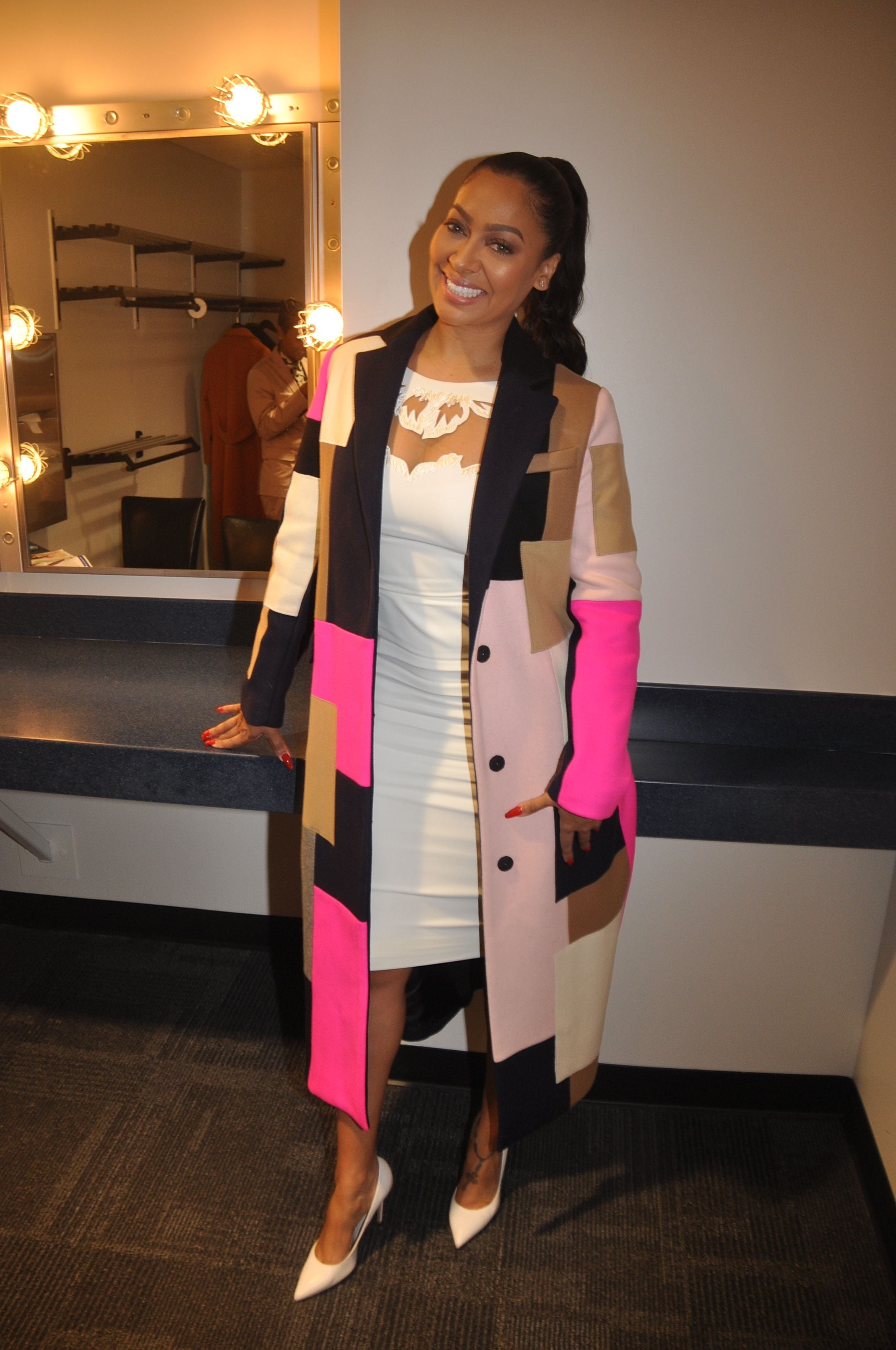 La La Anthony is looking pretty in her colorful coat while backstage at the 2018 School Counselor of the Year event at The Kennedy Center in Washington, D.C.