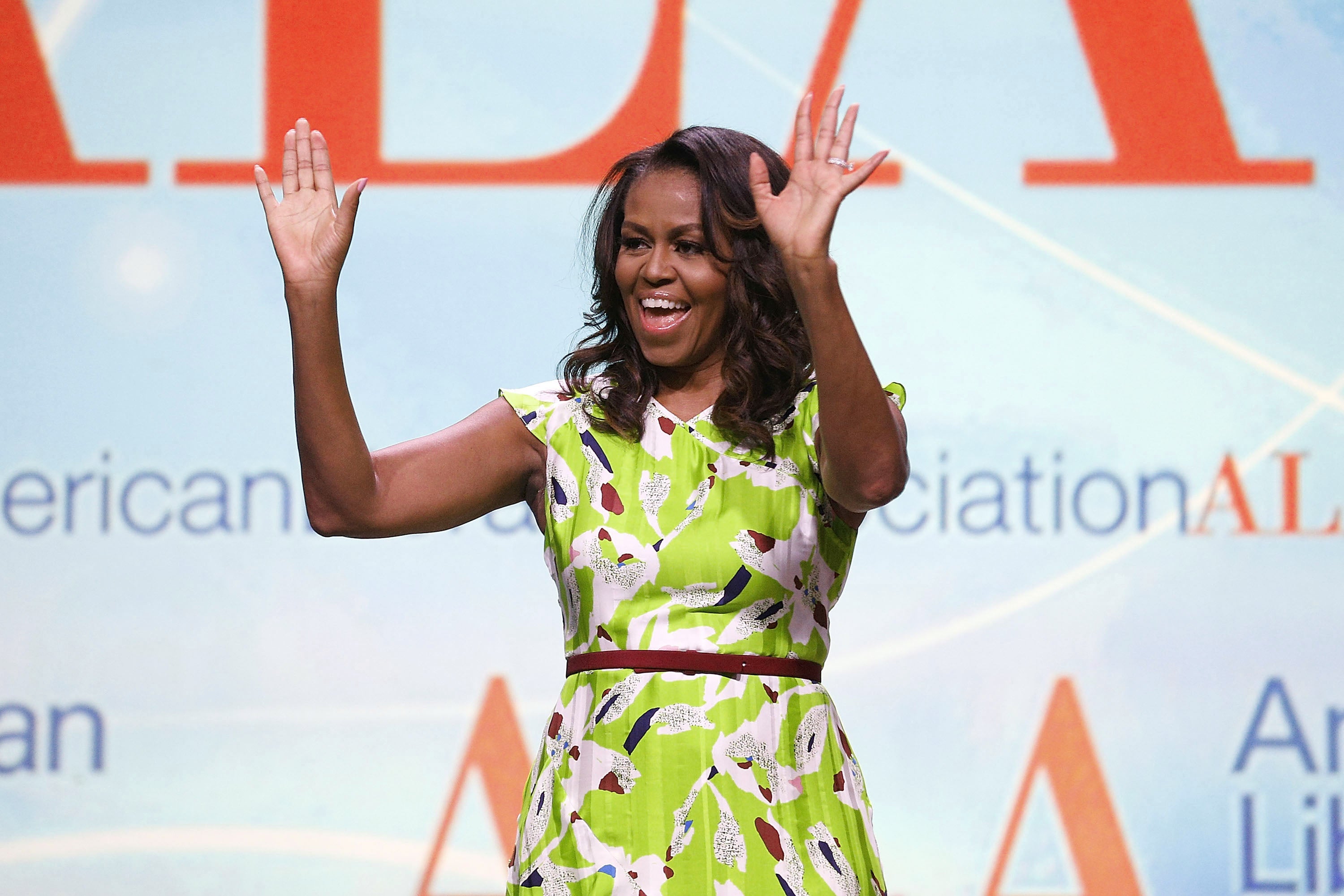 Former U.S. first lady Michelle Obama is all smiles as she hits the stage to discuss her forthcoming memoir titled, “Becoming”, during the 2018 American Library Association Annual Conference in New Orleans, Louisiana.