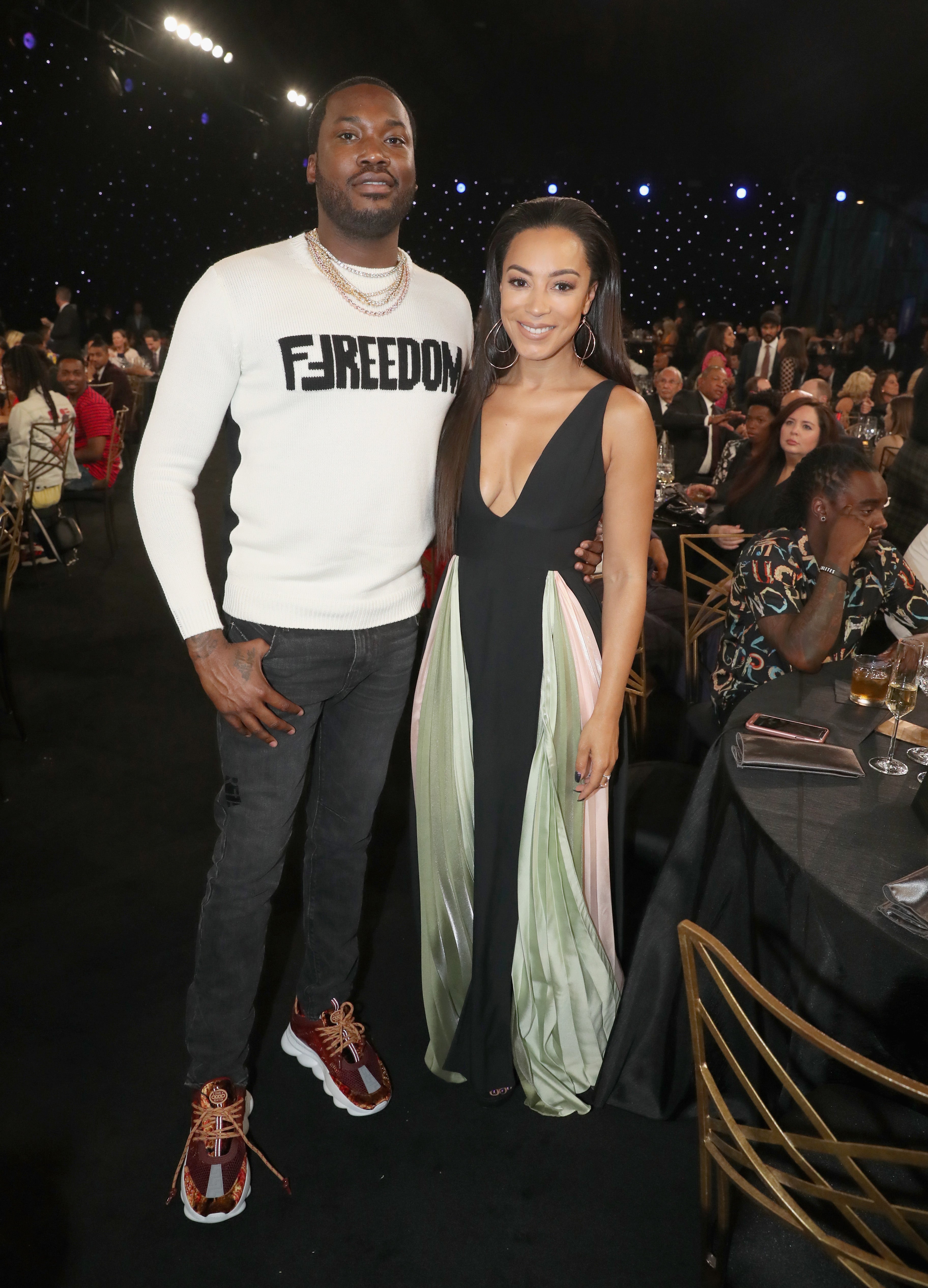 Meek Mill and Angela Rye pose together at the 2018 NBA Awards in Santa Monica, California.