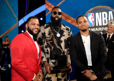 Anthony Anderson, MVP recipient James Harden and Mack Wilds pose onstage at the 2018 NBA Awards in Santa Monica, California.