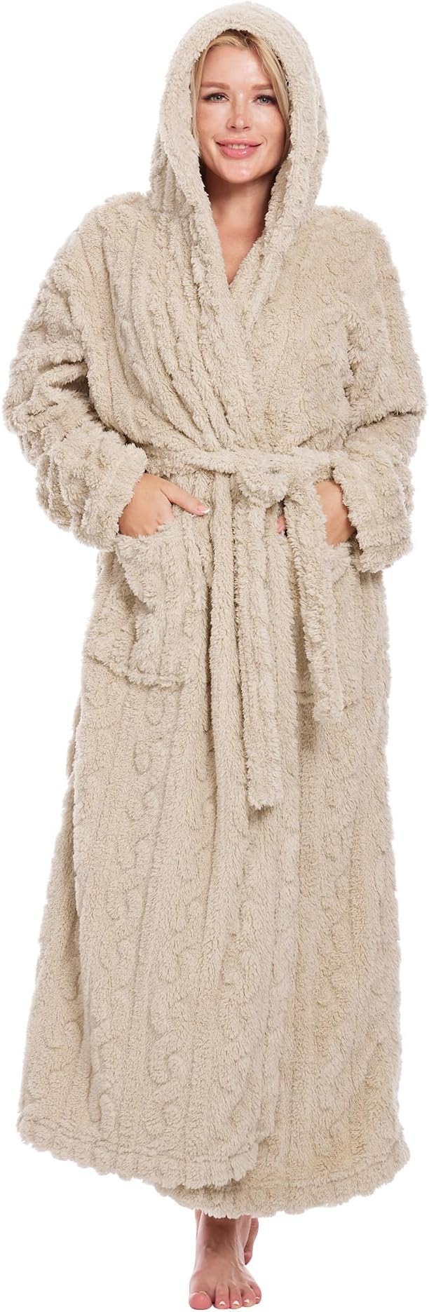 Women’s Textured Plush Robe – Soft Long Bathrobe with Hood and Pockets, Cozy Winter Loungewear Fleece Robe for Women