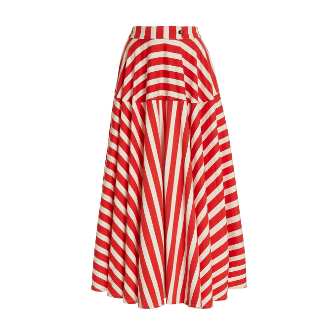 “[I] love this skirt because it is so well constructed and flows so effortlessly. I am obsessed with anything red and striped right now.”
