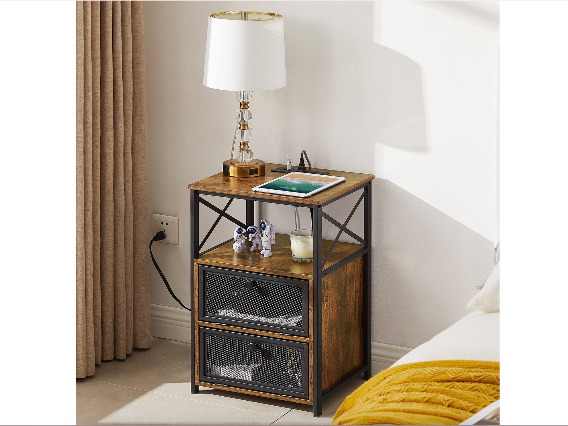 This unit has two drawers and a middle storage shelf, which is perfect for storing all your essentials. It also has two USB ports and AC outlets, so you can easily charge your devices.Available at Wayfair
