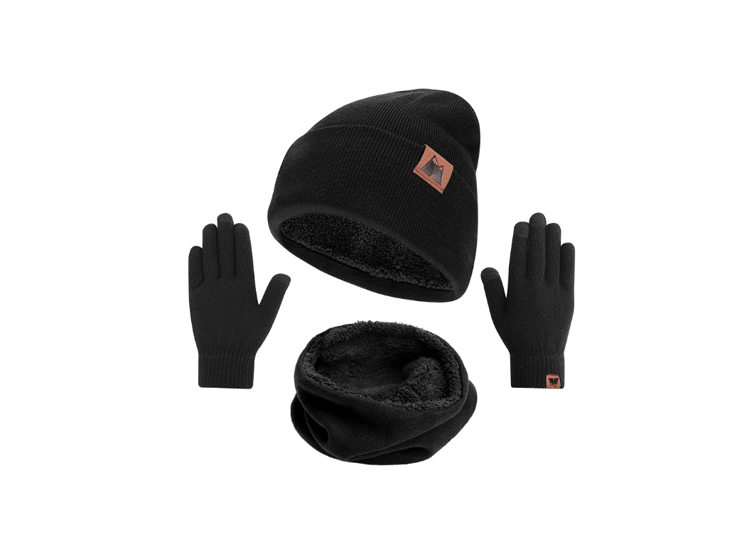 Includes: Hat, touchscreen gloves, neck warmer, earmuffs | Size: One size fits all | Colors: Black, gray, blue | Material: Acrylic, Fleece