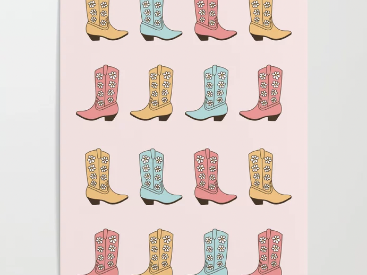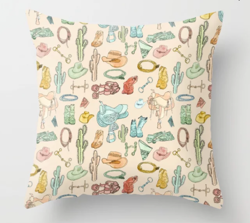 This cute throw pillow features cactuses, saddles, cowboy hats, and boots! It’s perfect to place on your couch or chair.Available at Society6