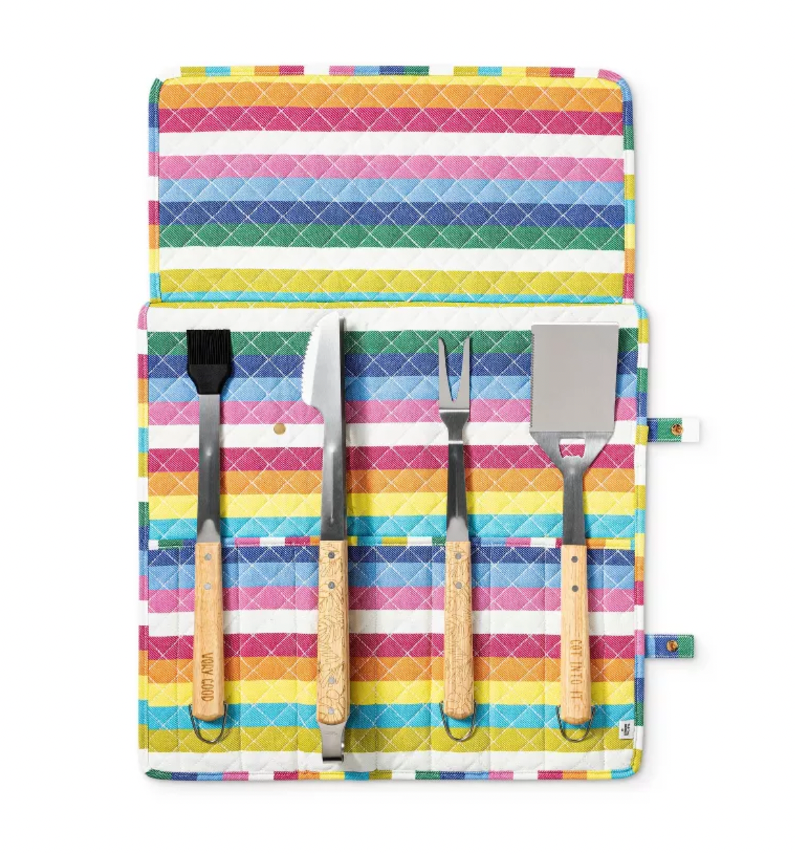 This Grilling Tool Set with Fabric Sleeve from Tabitha Brown for Target adds flair and convenience to your backyard barbecue. The tool set includes a fork, a grilling turner with a serrated edge, a pair of tongs, and a black brush. Each tool has a wood-finish handle, hanging metal hook, and stainless steel top. The sleeve with slot pockets for the four grilling tools completes the set in a vibrant style.Available at