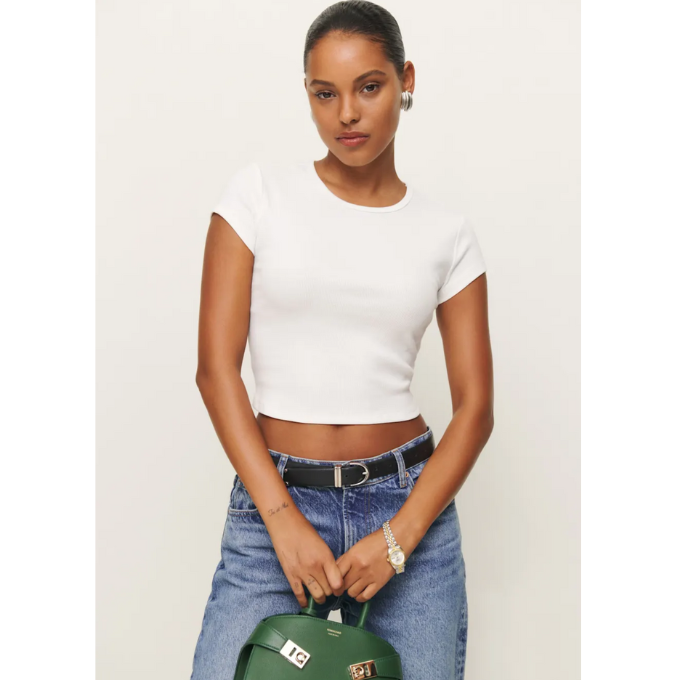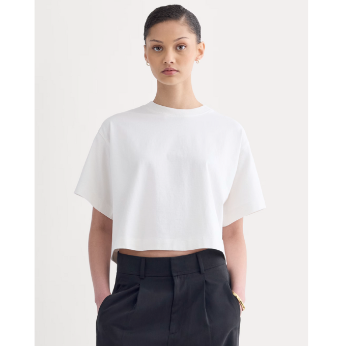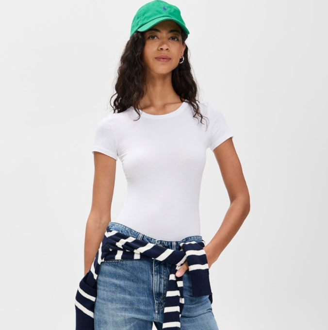 After silhouette, length is equally important. The last decade favored cropped cuts, but the Y2K revival has sparked a return to full-length tees, the kind that skim the hip and tuck cleanly into jeans without creating bulk. Cropped lengths will always have their place, whether that’s via a shrunken baby tee with a close-to-the-body fit or a deliberately boxy cut balanced by high-waisted denim.