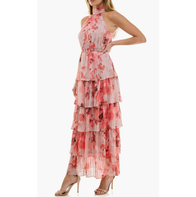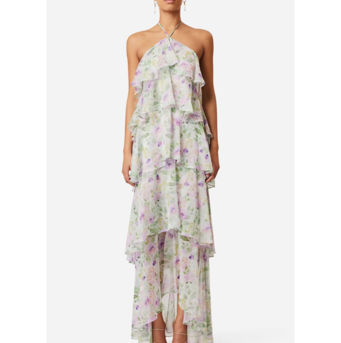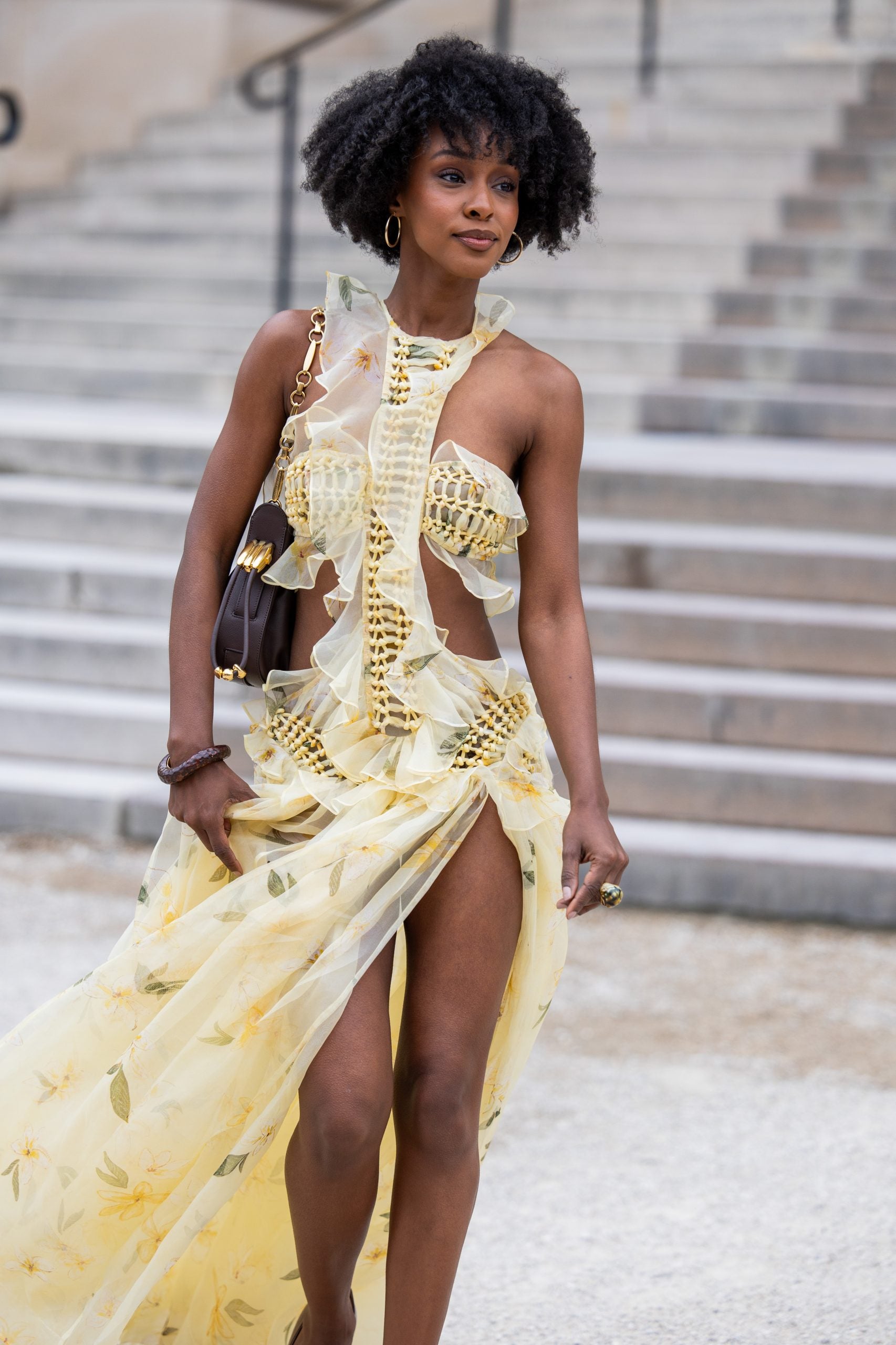 Spring’s perennial love affair with florals is getting a refresh—this season, it’s all about fluid fabrics, airy silhouettes, and soft, painterly prints that feel plucked straight from a dream. Actress Ebony Obsidian stuns in a sheer, ruffled dress that floats with every step, making a strong case for the new romanticism seen on runways like Chloé, Loewe, and Zimmermann. But it’s the accessories that ground the look: a deep brown shoulder bag, gold hoops, and a single chunky bangle offer balance against the dress’s ethereal energy. And you can float through spring in something just as dreamy with our curated picks below.