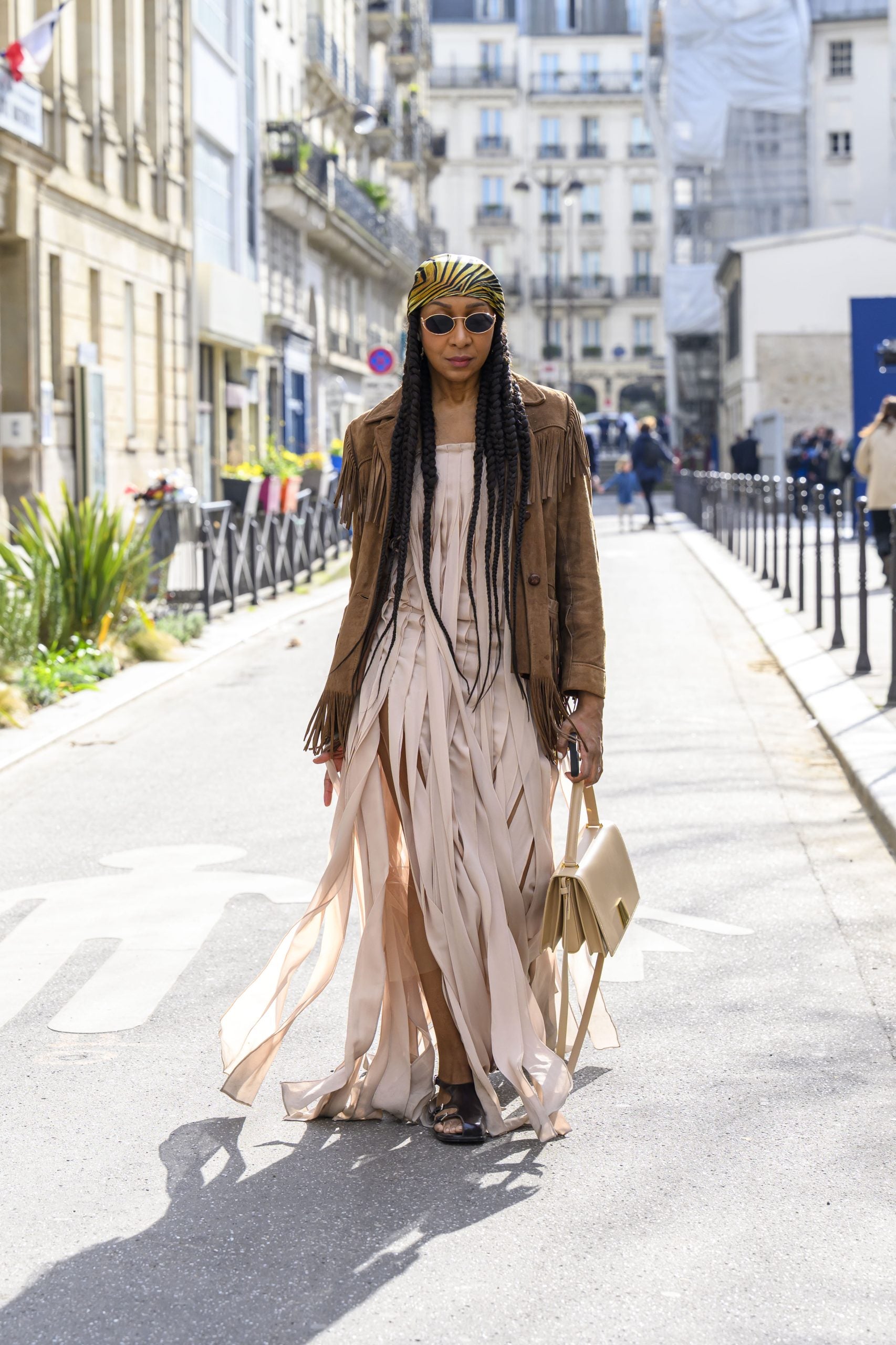 Karen Blanchard doesn’t just wear trends—she shapes them. The multi-hyphenate former street style photographer, blogger and now powerhouse content creator proves it in this boho-inspired look. Her flowing Akris dress, crafted from cascading ribboned panels, channels the undone 1970s flair seen on the runways of Chloé and Blumarine. A vintage suede fringe jacket adds texture and dimension, while a printed headscarf and Miu Miu sunglasses lend an effortless, retro-cool vibe. Finished with a structured top-handle bag and modernized fisherman sandals, the look proves that pulling a few standout details, like fringe, can effortlessly bring the boho revival into your wardrobe.