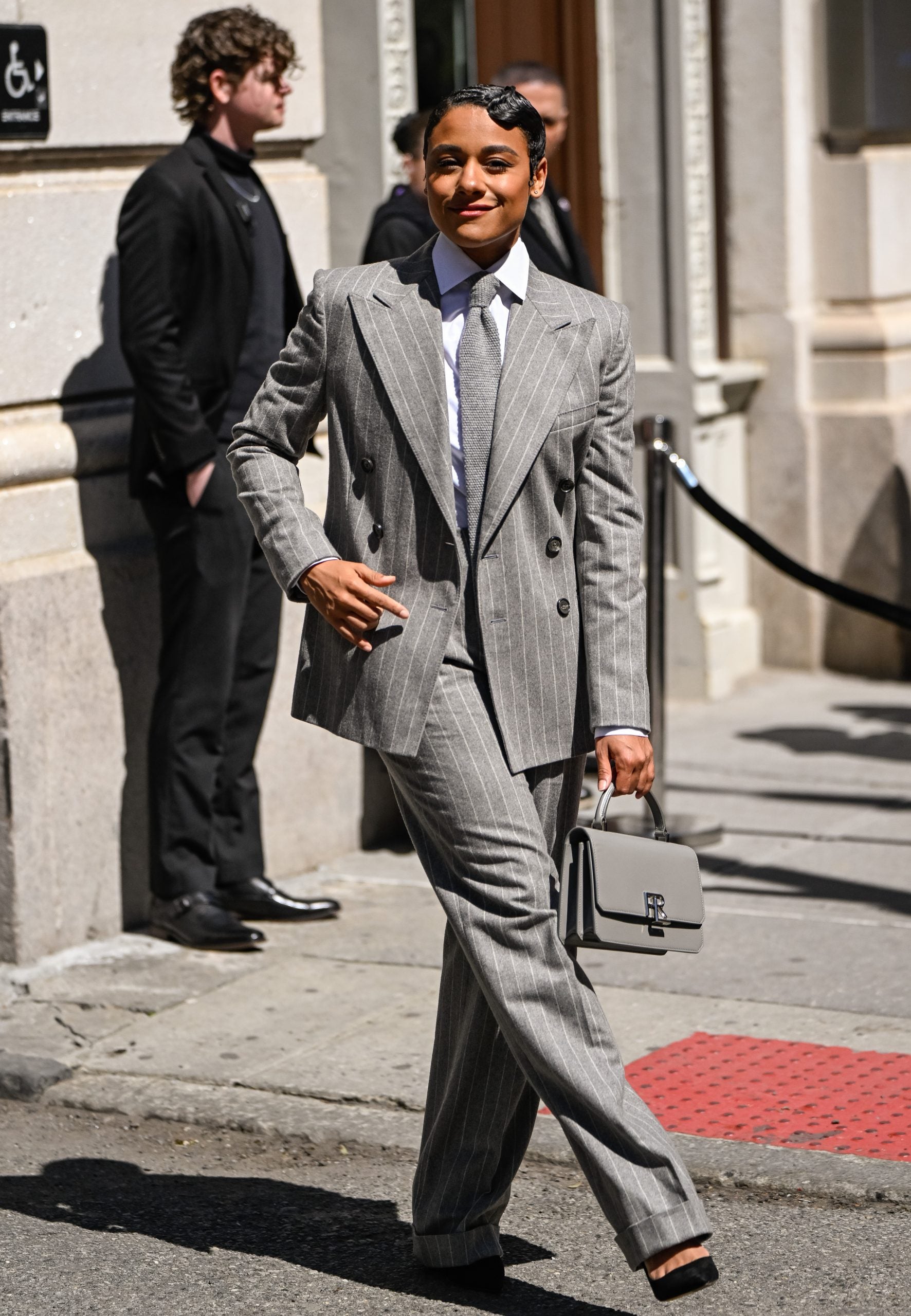 Back-to-office mandates have sparked a full-blown return to suiting, and Ariana DeBose delivers a master class in modern power dressing in head-to-toe Ralph Lauren. Her grey pinstripe suit nods to traditional menswear tailoring, but the exaggerated shoulders and double-breasted fit offer a sharp, updated silhouette. A crisp white shirt and textured tie double down on the corporate references, while a structured top-handle bag cosplays as a briefcase. This isn’t your average 9-to-5 uniform—it’s bolder, sleeker, and easily replicated with the lookalike pieces below.