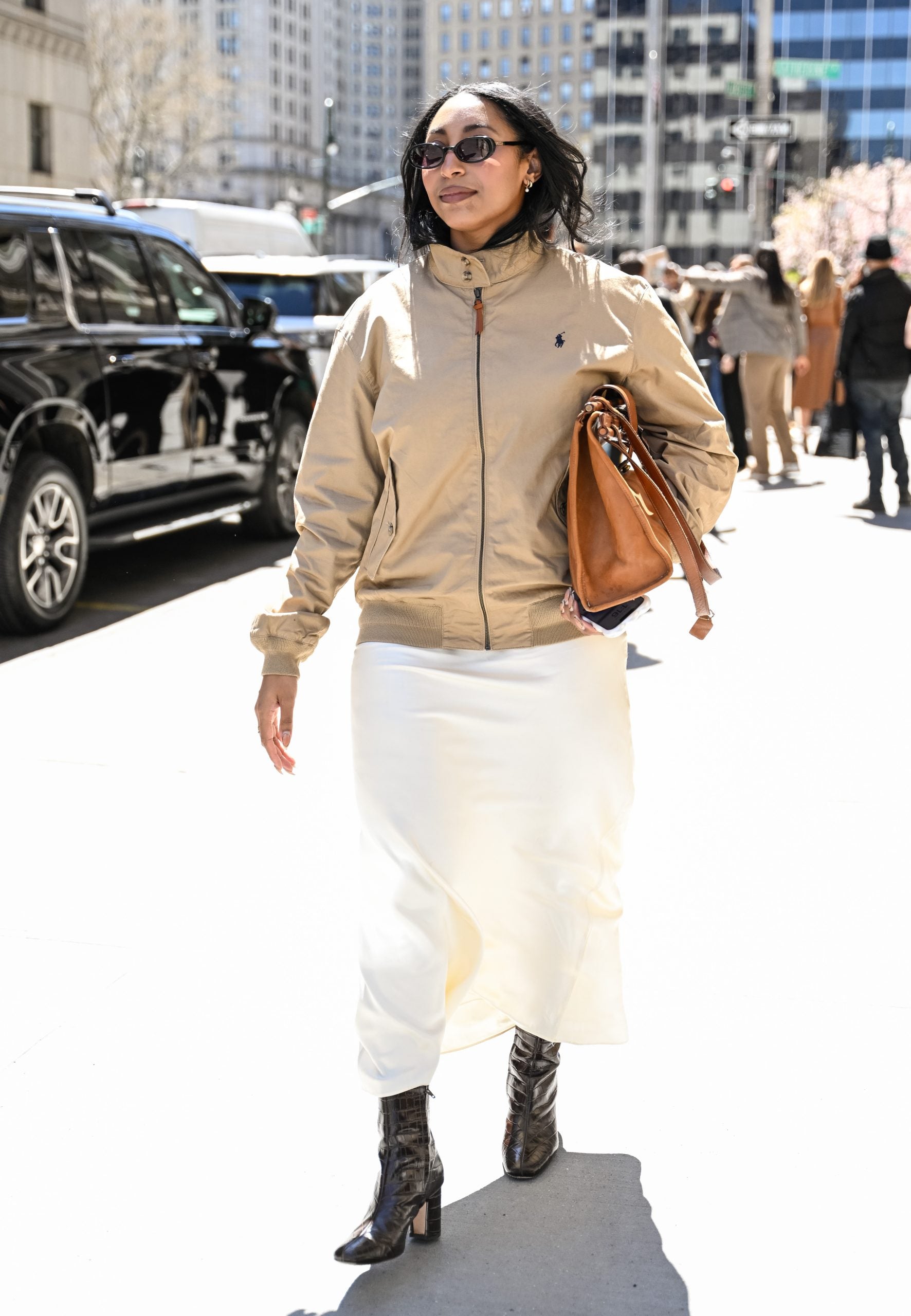 Designers like Miu Miu and Proenza Schouler have anchored their spring collections in nautical nostalgia, and this street style look spotted on USA Today editor Anika Reed captures the trend with an elevated twist. The Polo Ralph Lauren windbreaker channels yacht club prep, made cool with a minimalist palette. A sleek white midi skirt or slip dress softens the utilitarian feel, while black croc-embossed boots and a structured carryall bring the whole look ashore. It’s a modern interpretation of maritime style: effortless, coastal, and city-ready. The sea might be calling, but this look proves the trend sails just as well on concrete.