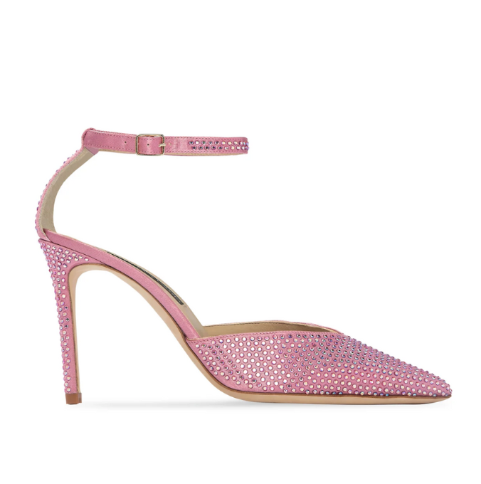 Shades of powdery pink dominated the runways at Chanel, Brandon Maxwell, and Jil Sander, where the spring-ready hue was embraced with the same softness and delicacy seen in this season’s bloom-focused looks. This street style look makes the case for going all in: a frothy ruffled dress, cinched with a structured belt, proves the hue can be both romantic and refined. Metallic pink heels mirror the palette but with a high-shine edge, while the heart-shaped bag leans into the look’s playful, whimsical energy. Whether worn head-to-toe or small doses, pink is your pastel power play, and you can shop it across fashion categories.