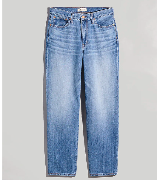 This pair of boyfriend jeans from Frame have a bit of a rounded hip but ultimately should fit true to size. The tapered hem and high waist is a flattering fit on curvier body types as well.