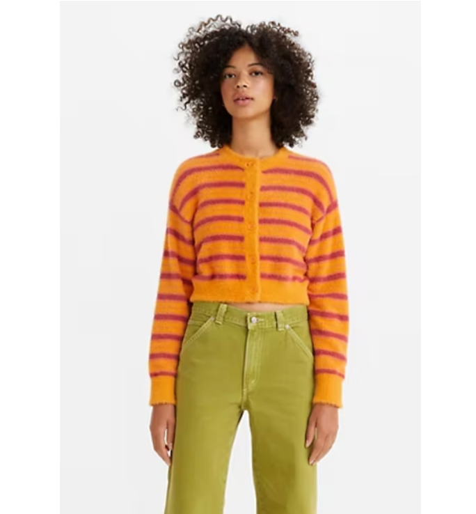 This vibrant cardigan from Free People is ideal for the woman who loves a bit of color in drab weather. The fabric is made of nylon, wool, and polyester to make it a light yet warm layer.
