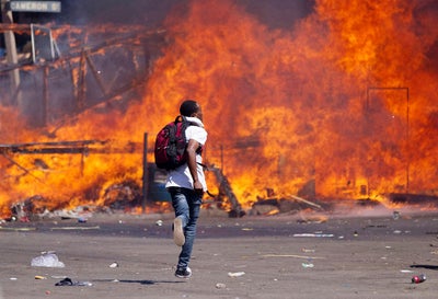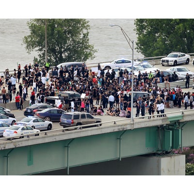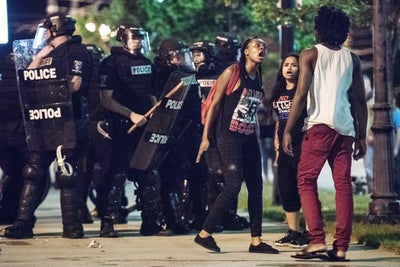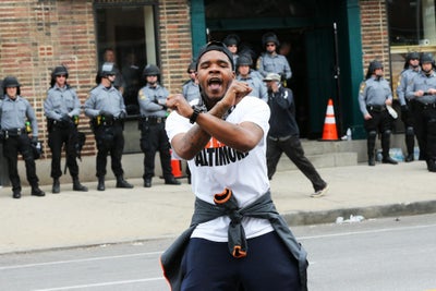 Meech Johnson gestures in the street in front of police after Baltimore authorities released a report on the death of Freddie Gray on May 1, 2015 in Baltimore, Maryland. Marilyn Mosby, Baltimore City state’s attorney, ruled the death of Freddie Gray a homicide and that criminal charges will be filed. Gray, 25, was arrested for possessing a switch blade knife April 12 outside the Gilmor Houses housing project on Baltimore’s west side. According to his attorney, Gray died a week later in the hospital from a severe spinal cord injury he received while in police custody.