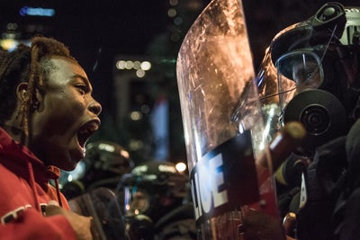 Demonstrators confront police during a protest following the release of a video showing Chicago Police officer Jason Van Dyke shooting and killing Laquan McDonald in Chicago, Illinois. Van Dyke was charged today with first degree murder for the October 20, 2014 shooting in which McDonald was hit with 16 bullets.