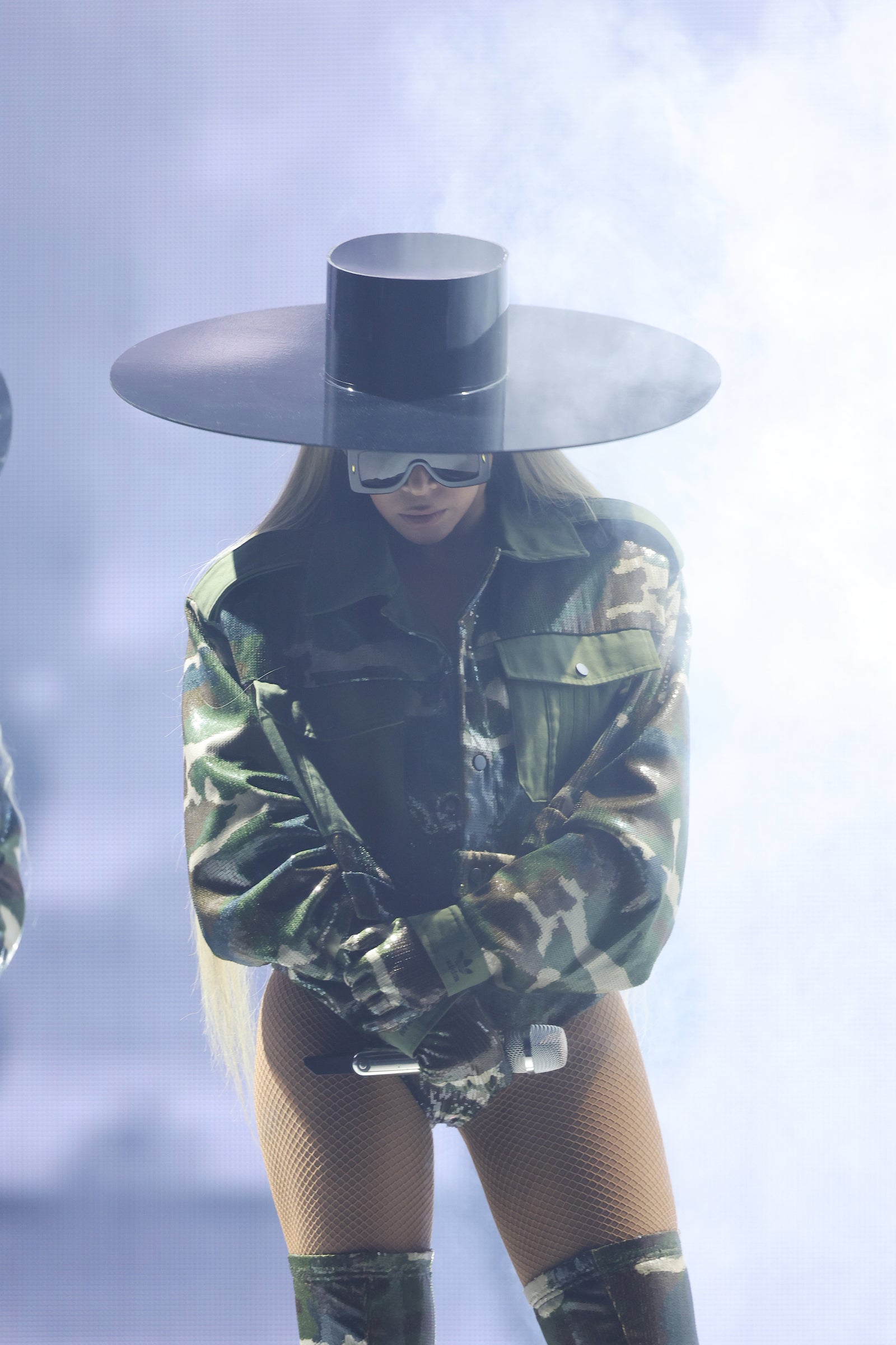 While the large screens positioned over the main stage like an archway served as the primary source of visuals during the concert, one of the more tactile images impressed on concertgoers was the vision of Beyoncé gliding across the stage seated on a silver mechanized tank as she sang “Black Parade.” The song followed a performance of “Formation” and “Run the World (Girls)” during which Beyoncé wore an Ivy Park sequin camouflage bodysuit paired with a cropped sequin camouflage jacket and matching thigh-high boots.