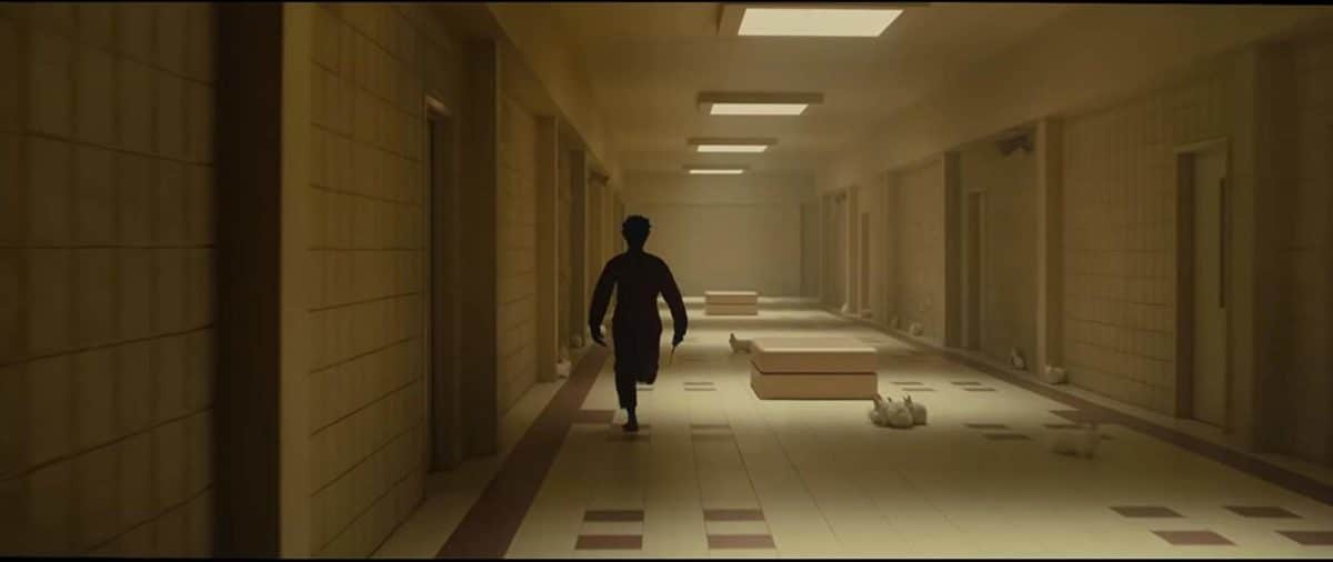 In this windowless underworld, we see dank salmon pink hallways that resemble any penitentiary, with those harsh overhead lights that become unbearable after a couple of hours. All you see are doors and doors flanking a long hallway. In a flashback, each door shows us the Untethered trapped inside pretend activities, while another door shows bunnies trapped inside actual cages — like tiny little jail cells. This is another clue, Peele said.