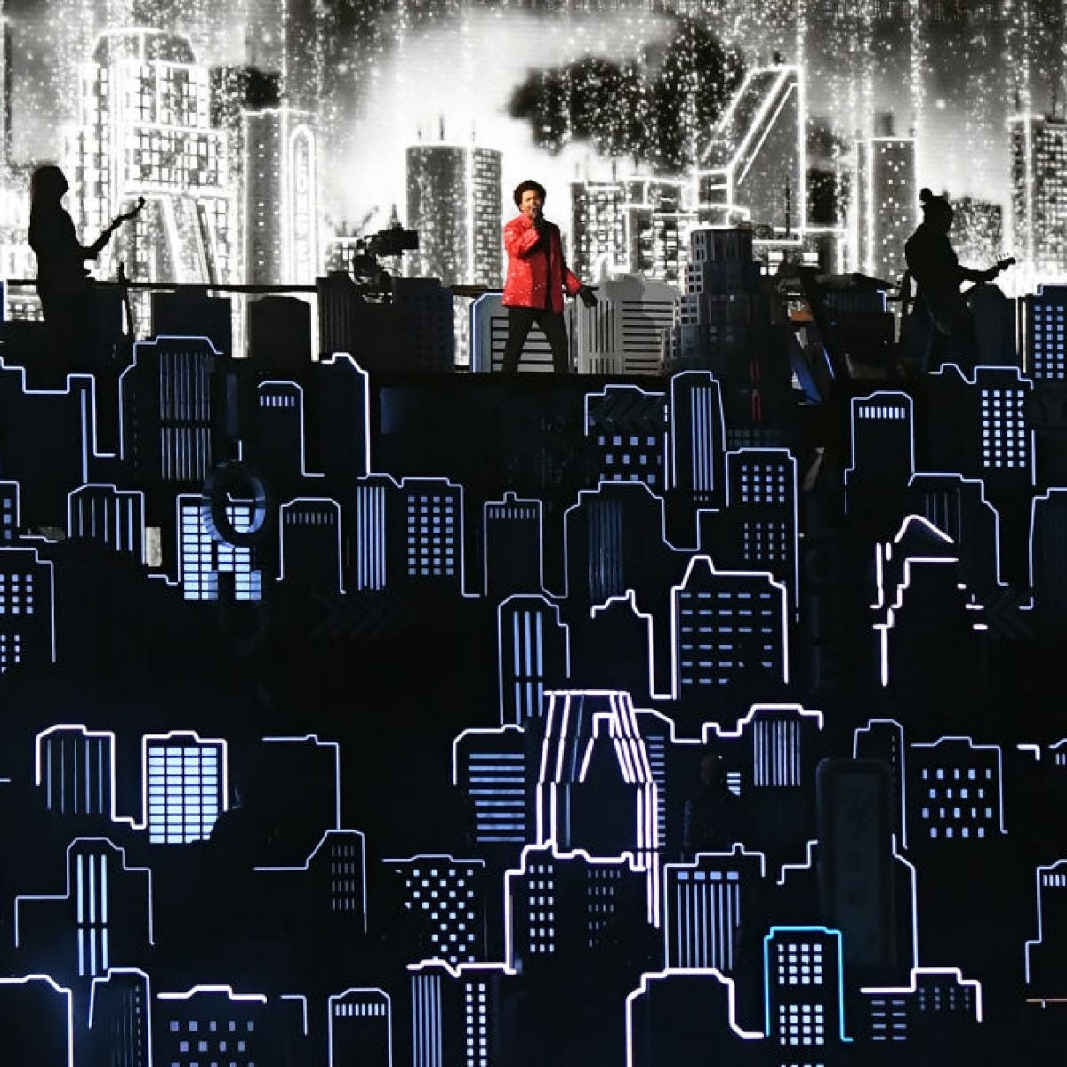 The Weeknd also performed “I Feel It Coming,” “Save Your Tears,” “Earned It,” and surprised viewers with a throwback classic from his mixtape House of Balloons, “Glass Table Girls.” During the latter, The Weeknd joined his army of dancers on the field for an ensemble performance, which closed out with “Blinding Lights,” complete with a short firework display to end the set.