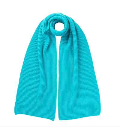 This Scottish brand continues to create beautifully crafted knits (two hundred plus years of expertise in textile manufacturing). 100% cashmere. Johnstons of Elgin Ribbed Cashmere Scarf in Turquoise.