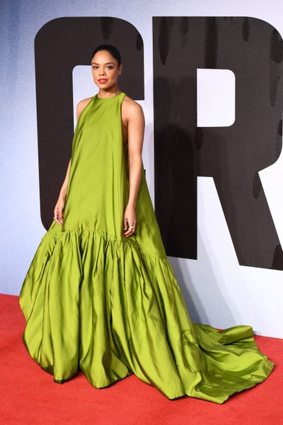 Tessa Thompson continued her green streak in a floor-length Valentino gown for the European Premiere of “Creed II.”