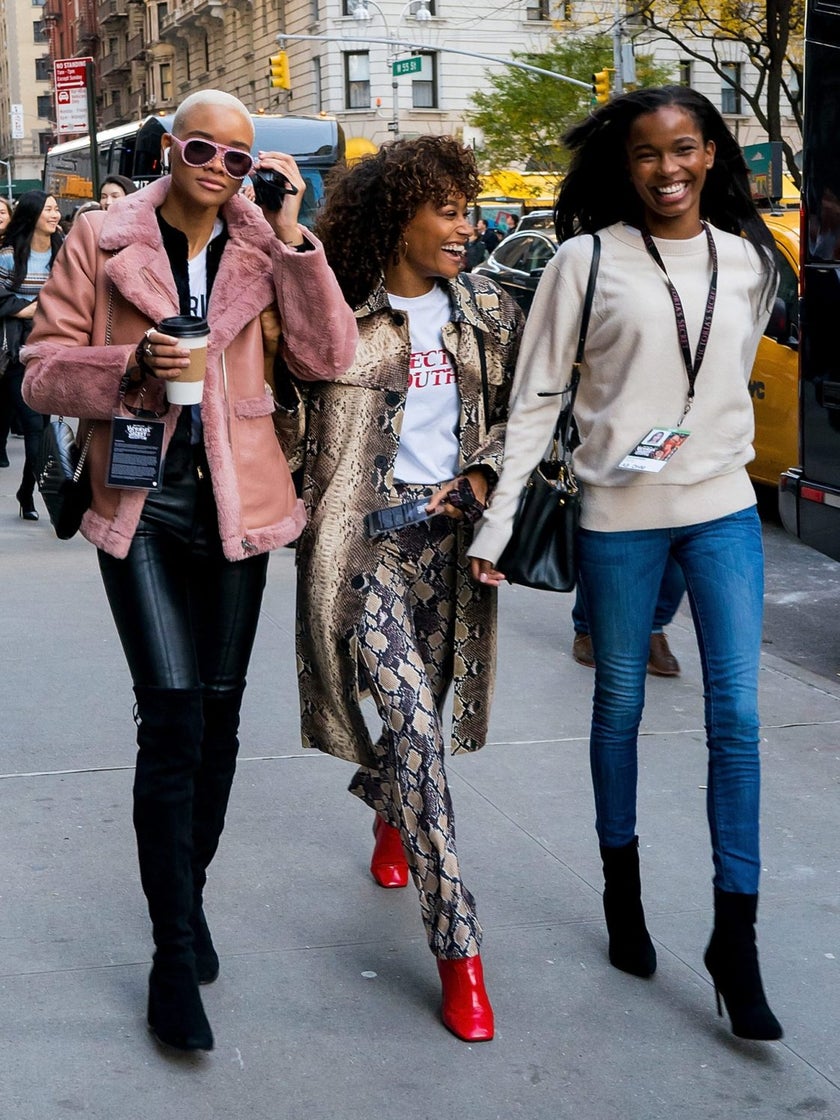 NEW YORK, NY – NOVEMBER 07: (L-R) Iesha Hodges, Cheyenne Maya-Carty and Isilda Moreiraattend rehearsals for the 2018 Victoria’s Secret Fashion Show in Midtown on November 7, 2018 in New York City. (Photo by Gotham/GC Images)