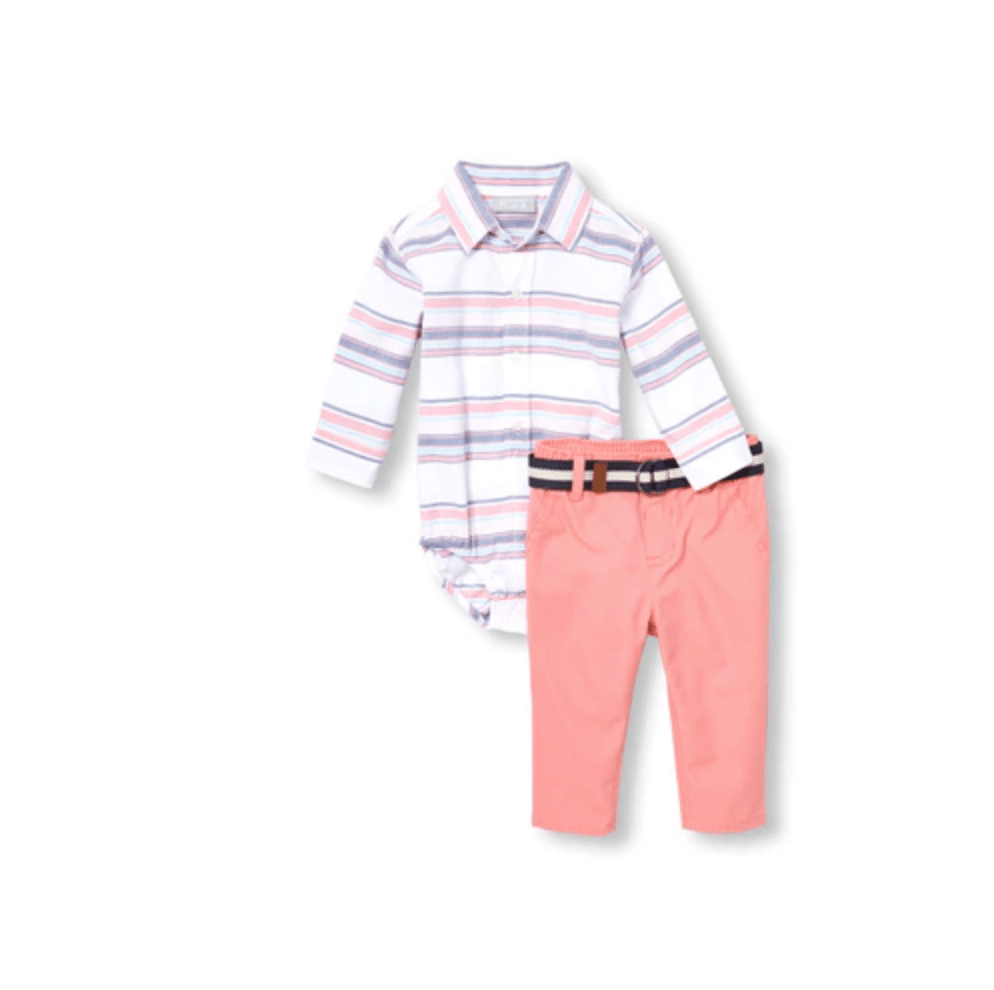 Striped Oxford Button Down Bodysuit And Chino Pants Set, $10