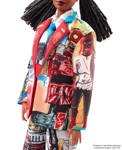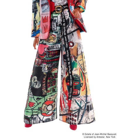 The Jean-Michel Basquiat x Barbie Doll is centered around two significant icons. In an haute couture statement, the doll wears a printed color blocking original power suit emblazoned with Basquiat’s most recognizable work. Her glam features a black lip, sculptured x-shaped braided hair style and a gold crown to top it off.
