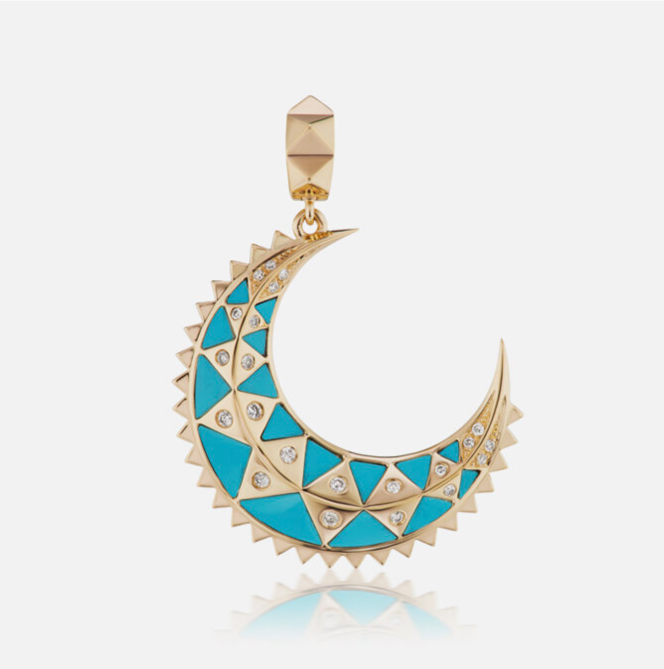 Lauren Harwell Godfrey is an uber talented jewelry designer, a Black Californian and a former art director in advertising. Her namesake line is handcrafted in 18K gold with precious gemstones, powerful inlay and vivid enamel. She often references ancient textiles and patterns from the African Diaspora. The Jewelers of America have nominated her for a 2022 Gem Award in Jewelry Design (winners will be announced in January 2022). Let’s not only support her brand but also wish her the best of luck! Harwell Godfrey “Mini” Moon Pendant, 18K Yellow Gold Medallion with Inlay Turquoise and Diamonds