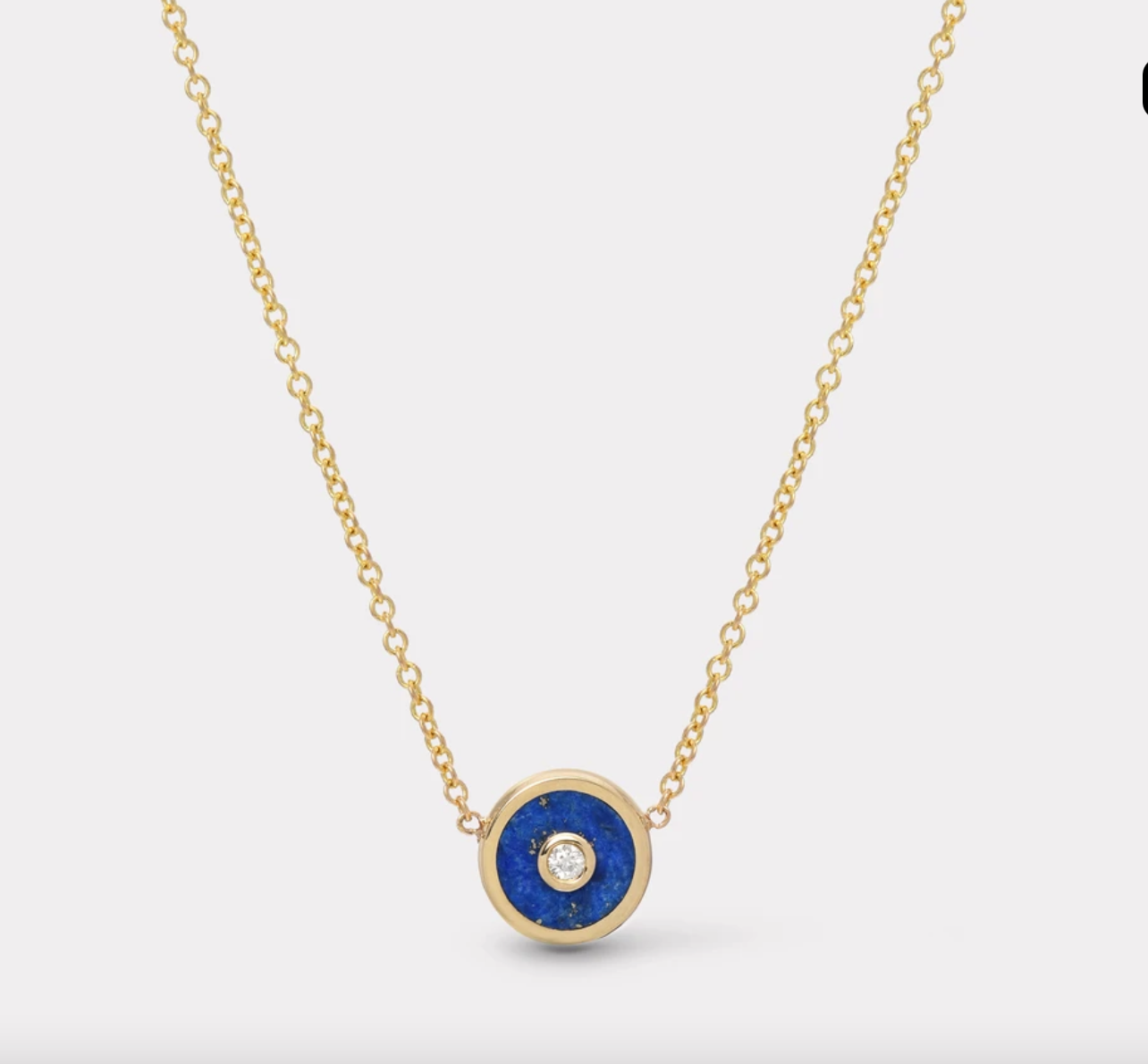 I love lapis lazuli. The Egyptians saw it as a symbol of the night sky and for centuries its been associated with intelligence, royalty and truth. The diamond in this pendant reminds me of a bright star in a dark but dreamy sky. Jewelry designer and founder of Retrouvai Kristy Stone says “The Retrouvaí woman has a collector’s mentality and believes that ‘everyday’ jewelry doesn’t need to be basic…” Her designs mix the old with the new, heirloom quality with a dose of fun. Every piece is handmade to order in Los Angeles (typical production time is 3-4 weeks). The hand cut lapis inlay is set in 14k gold with a center diamond. The necklace is 16″ in length. Retrouvai Mini Compass Pendant in Lapis