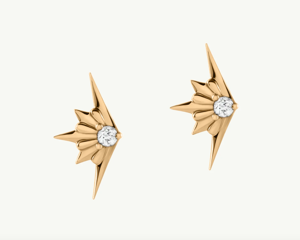 Designer Angie Marei was born and raised in New York City. The Egyptian-Dominican designer describes her work as “fearless and seductive. Before diving into jewelry-making, she was a creative-director in advertising, working with global fashion and beauty luxury brands, including Gucci, Saint Laurent, Tom Ford, Estee Lauder and L’Oreal. Her striking, luxe-noir pieces are celebrity favorites, worn by Beyonce, Rihanna, Zendaya, Billy Porter and so many more. MAREI Aza Celestial Micro Diamond Stud Earrings in 14K Yellow Gold
