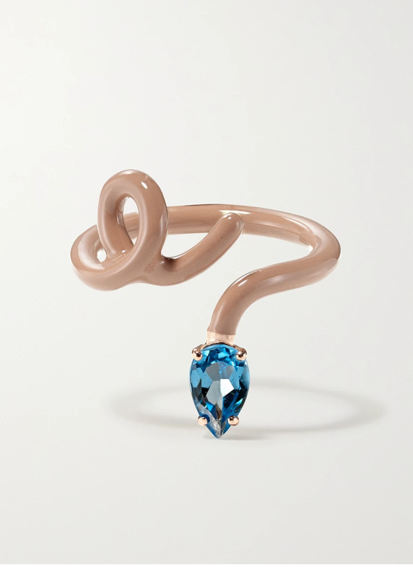 Bea Bongiasca is a millenial Italian jewelry designer who focuses on jewelry as an art form. She graduated with honors in Jewelry Design from the prestigious Central St. Martins in London, in 2013 and launched her namesake company the following year. Her design inspiration comes from a passion for color, pop culture and contemporary art and design. Precious and semi-precious stones and metals are combined with bold and bright enamel color, a delightful fusion of art and treasure. Bea Bongiasca Baby Vine Tendril Ring in Warm Taupe