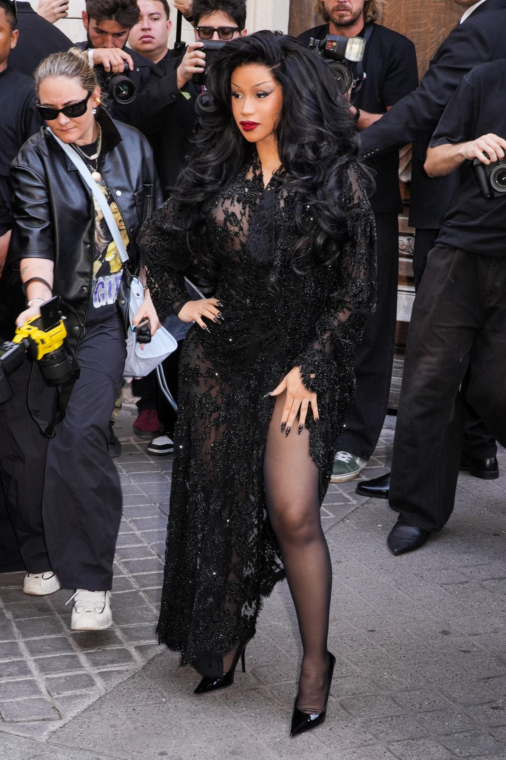 For the Balenciaga Couture show, Cardi left many of us in a state of sheer wonder when she wore a see-through floral gown with a pair of black patent leather pumps. The frock was nearly floor-length and was designed with hundreds of intricate beads throughout. An ultra-high slit brought the drama to this ensemble.