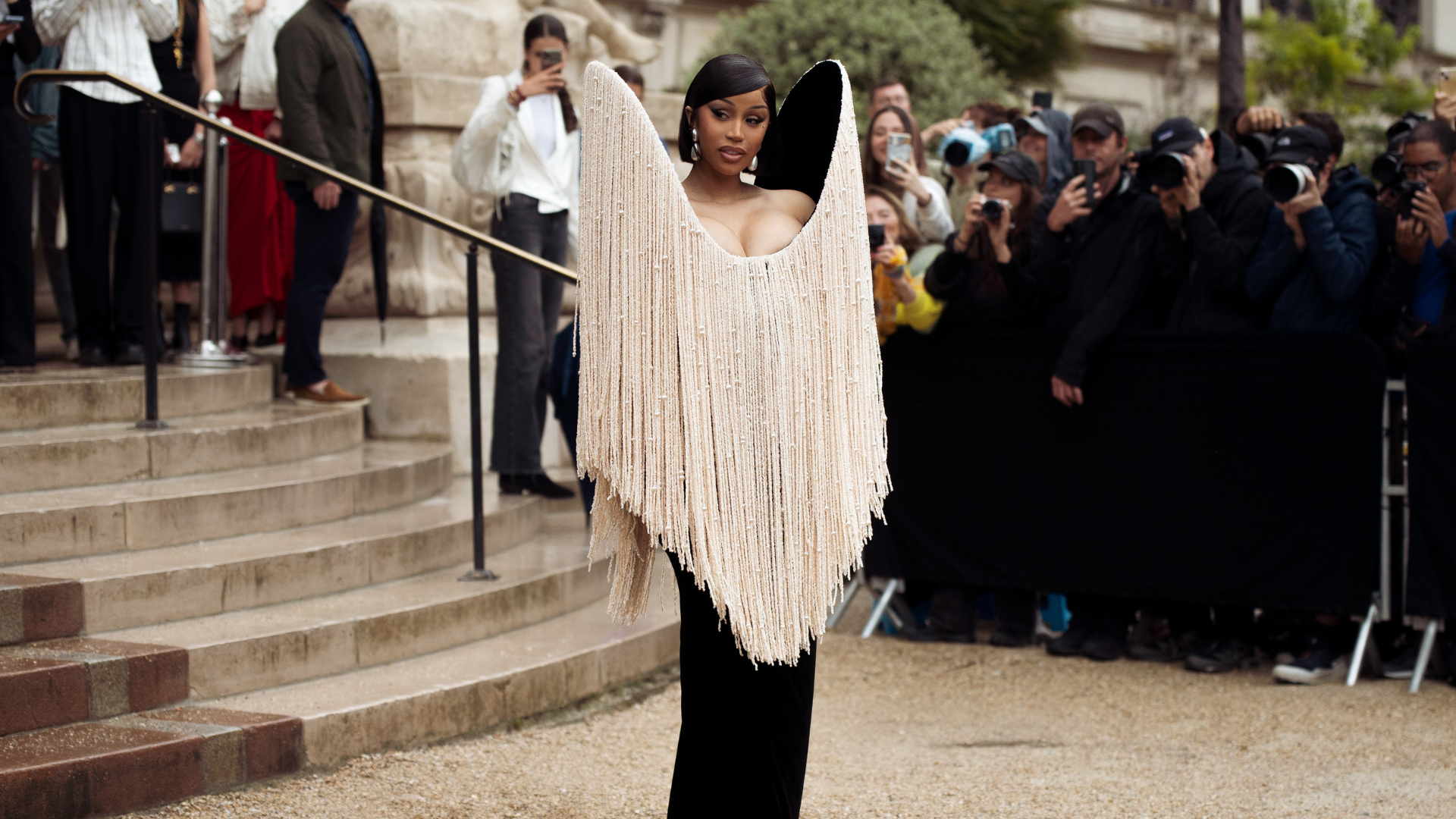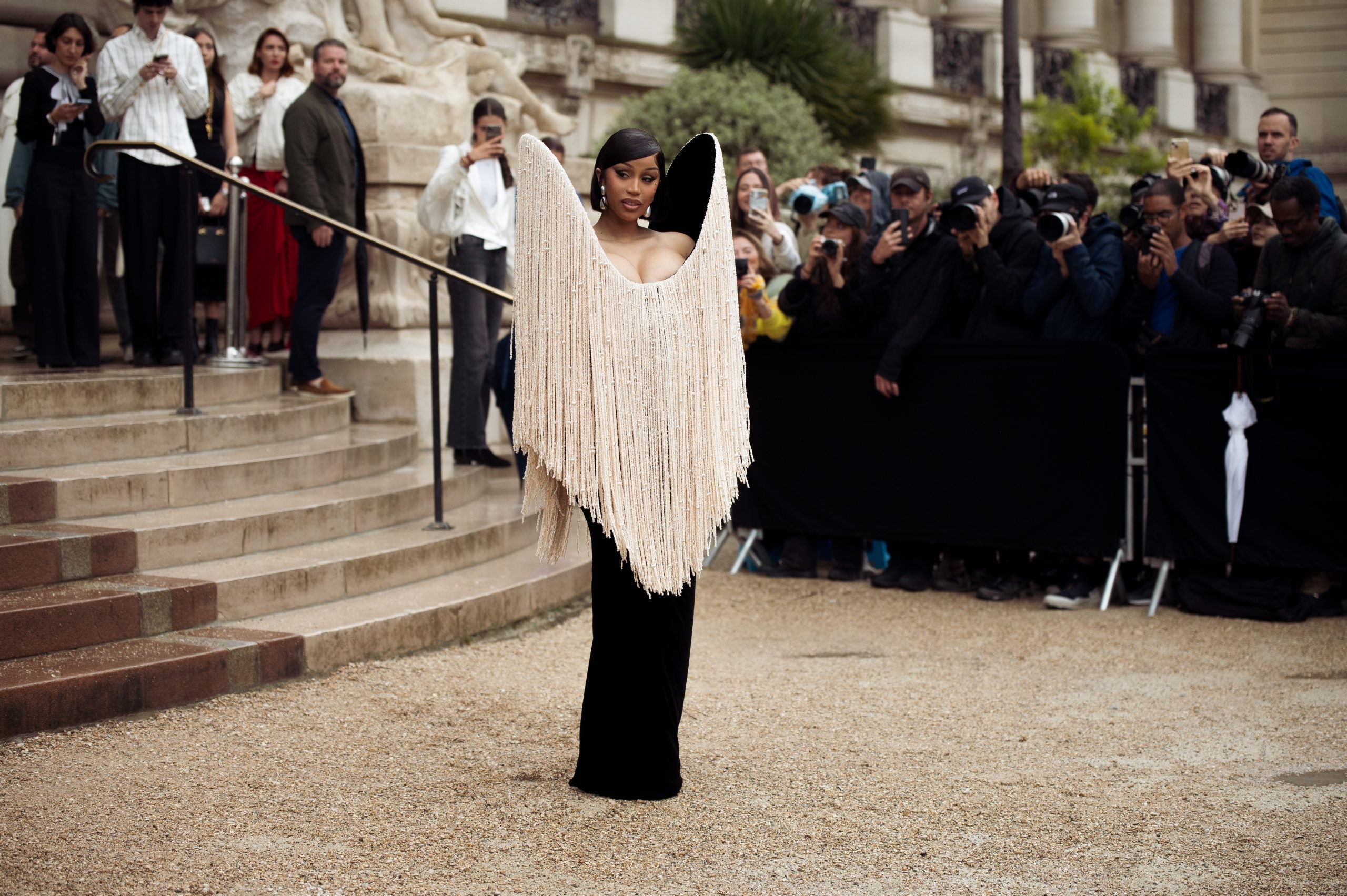 Earlier in the week, to kick off the outfits that were on the horizon, Cardi arrived for the Schiaparelli show in a gown featuring structured shoulders. The cream-hued fringe detailing was exquisite, and it extended from her shoulders to the floor. Additional accessories included lengthy black gloves and a pair of sky-high black heels, which both added an elevated touch to the ensemble.