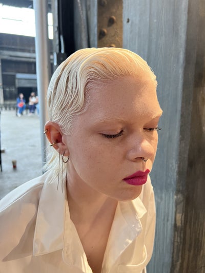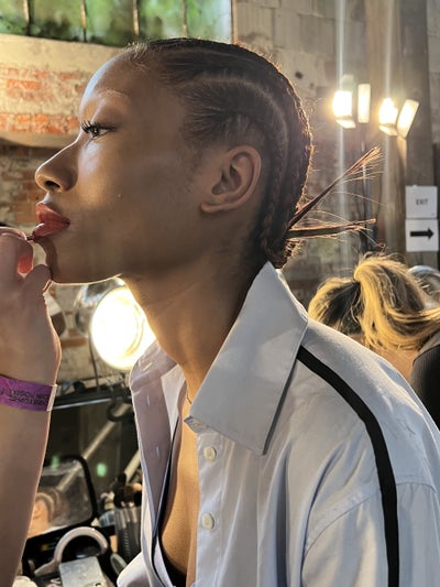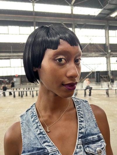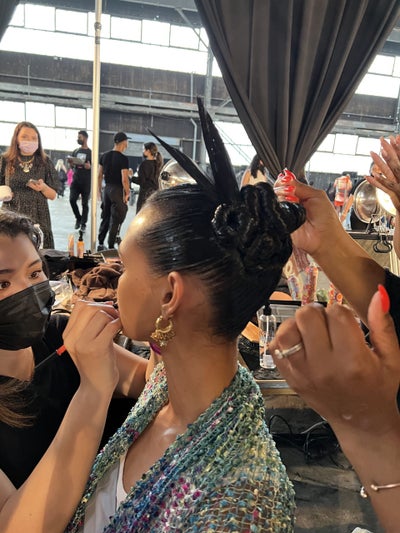 “For this show, I’m tapping into visuals I was inspired by when growing up in Brooklyn in the 90’s,” she shares with ESSENCE exclusively. “This corkscrewed spikey knot look is achieved using techniques I learned from local Black hair salons and Black hair magazines.”