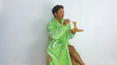 If you needed an excuse to purchase a chic robe, now is the time. When you’re not in the mood to put on any clothes, a robe can make you feel that much better. Sometimes a mod cover-up is all you need to enjoy your day. And possibly a plate of spaghetti, like Ellie.