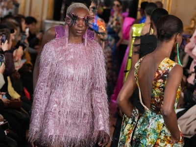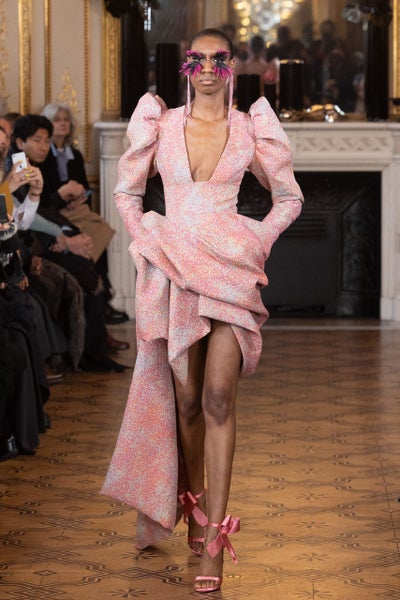 For our final ‘Couture Look of the Day,’ we’re focusing on the entire collection of Cameroonian designer Imane Ayissi. The designer perfectly fused elements of African design (raffia-lined hems, weaving techniques, and a bright color palette) with more western couture design elements. Models glided through the corridors of a Parisian mansion in jewel tones, 60’s era feathered eyelashes, sequins, and capes — there was no shortage of glamour.