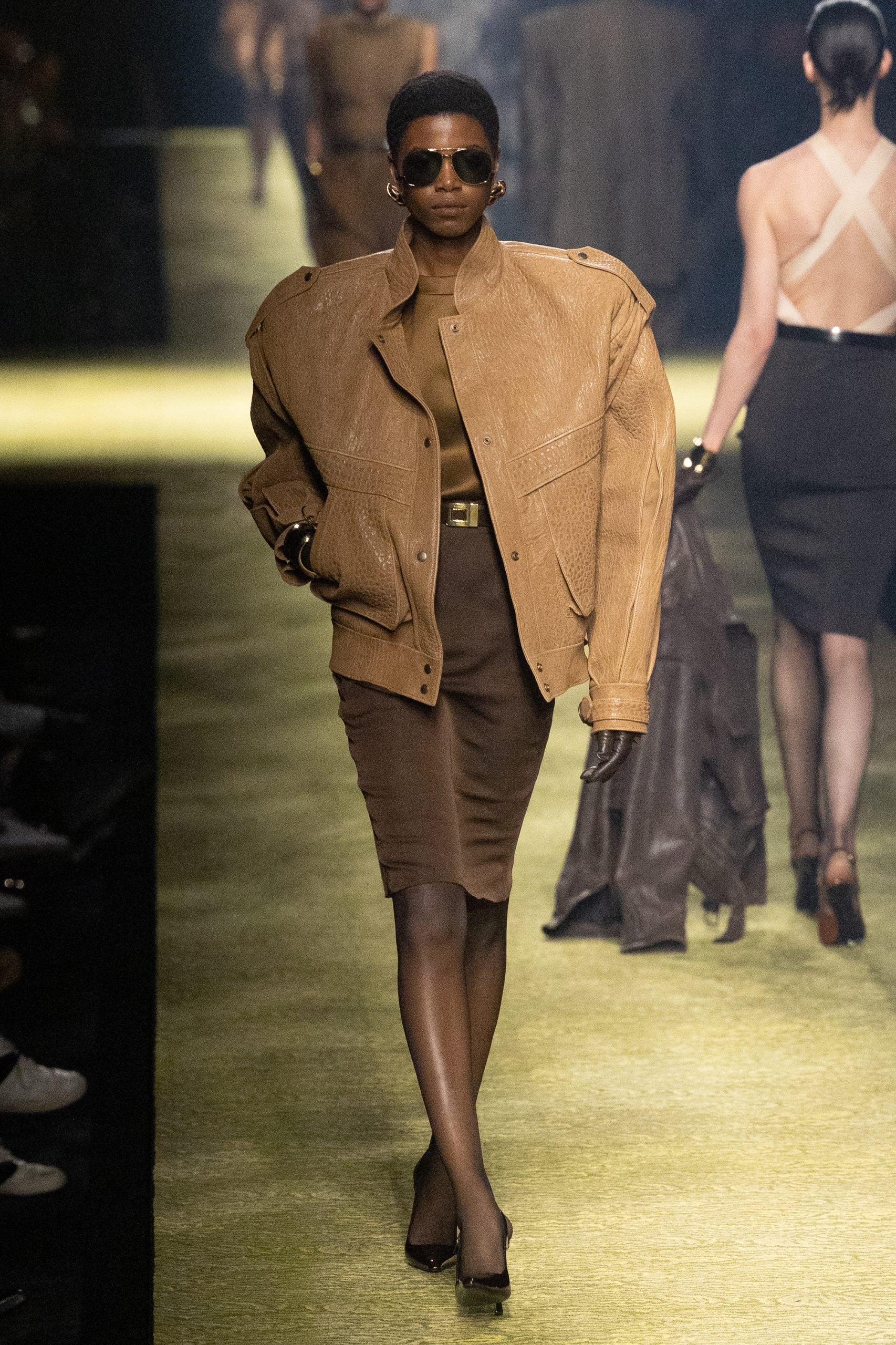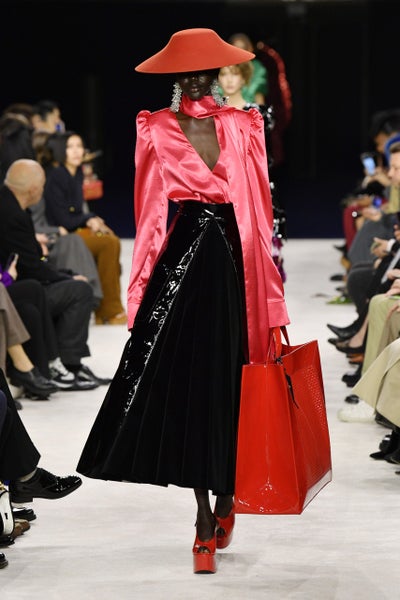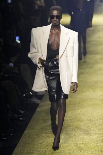 On the same wavelength as Balmain, Vaccarello also referenced the 80s through a high-camp, high-glam lens. Reaching back into the Saint Laurent house codes, he re-imagined the ballroom where Yves himself began showing collections. The clothes also channeled that OG YSL glamour along with the referential set design. Exaggerated, oversized boxy blazers, pussybow blouses, every look styled with a pair of oversized aviators, draped pashmina, leather, tweed, check, pinstripe — “I don’t sleep in my clothes, nor do I sleep with them.”