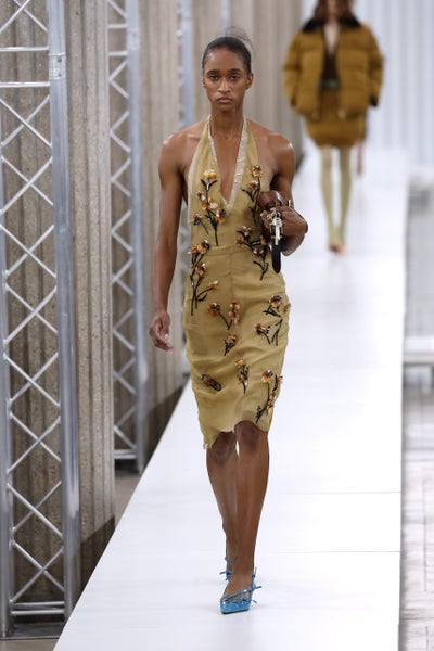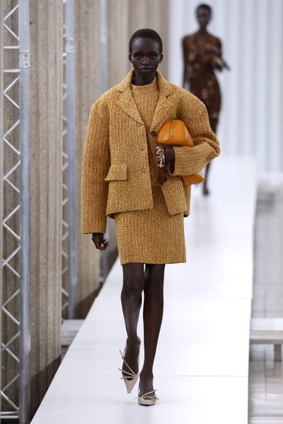 For Ib’s sophomore collection as the new Art & Image Director, he took us to the cosmos. Titled Lunar Delivery, the show, with its red sand set and reflective sphere, showcased a new design language at the house founded by the late Virgil Abloh. For Fall/Winter 2023, Ib merged his lens (one inspired by Africa) with the futuristic, explorative ethos of the house. The knits were especially a highlight. Like, look 24 (below), a knit jacket and dress designed in this ombre orange, yellow, green, and maroon effect that both evokes a futuristic, dystopian vibe and yet is totally of now. With this direction, we’re excited to see where he takes the brand.