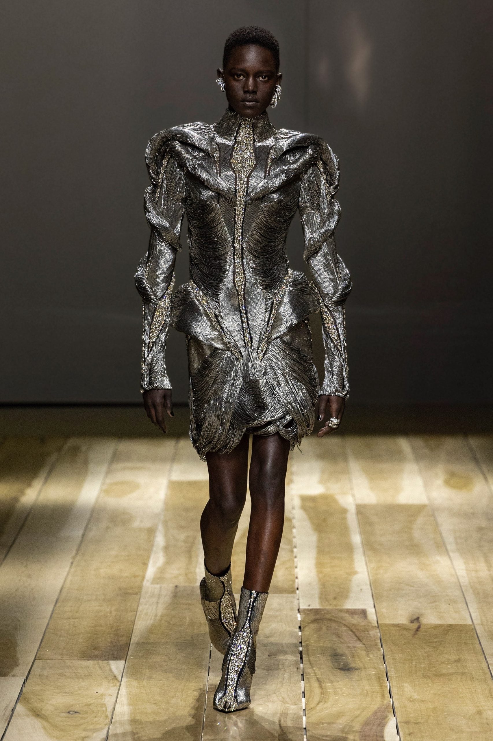 Sarah Burton does it season after season. The way she continues to mix in her own signature codes while paying homage to the house codes is an art. This collection showed the new kids why tailoring rules supreme at McQueen. Exceptionally crafted suits, jackets, and coats paired alongside beautifully crafted gowns and jumpsuits. Look 39 (below) is exquisite; this metallic and gold embellished dress, sculpted in an anatomical way to mic the body — wow. Also, having Naomi open the show and her supermodel daughter Adut close the show was the icing on the cake.