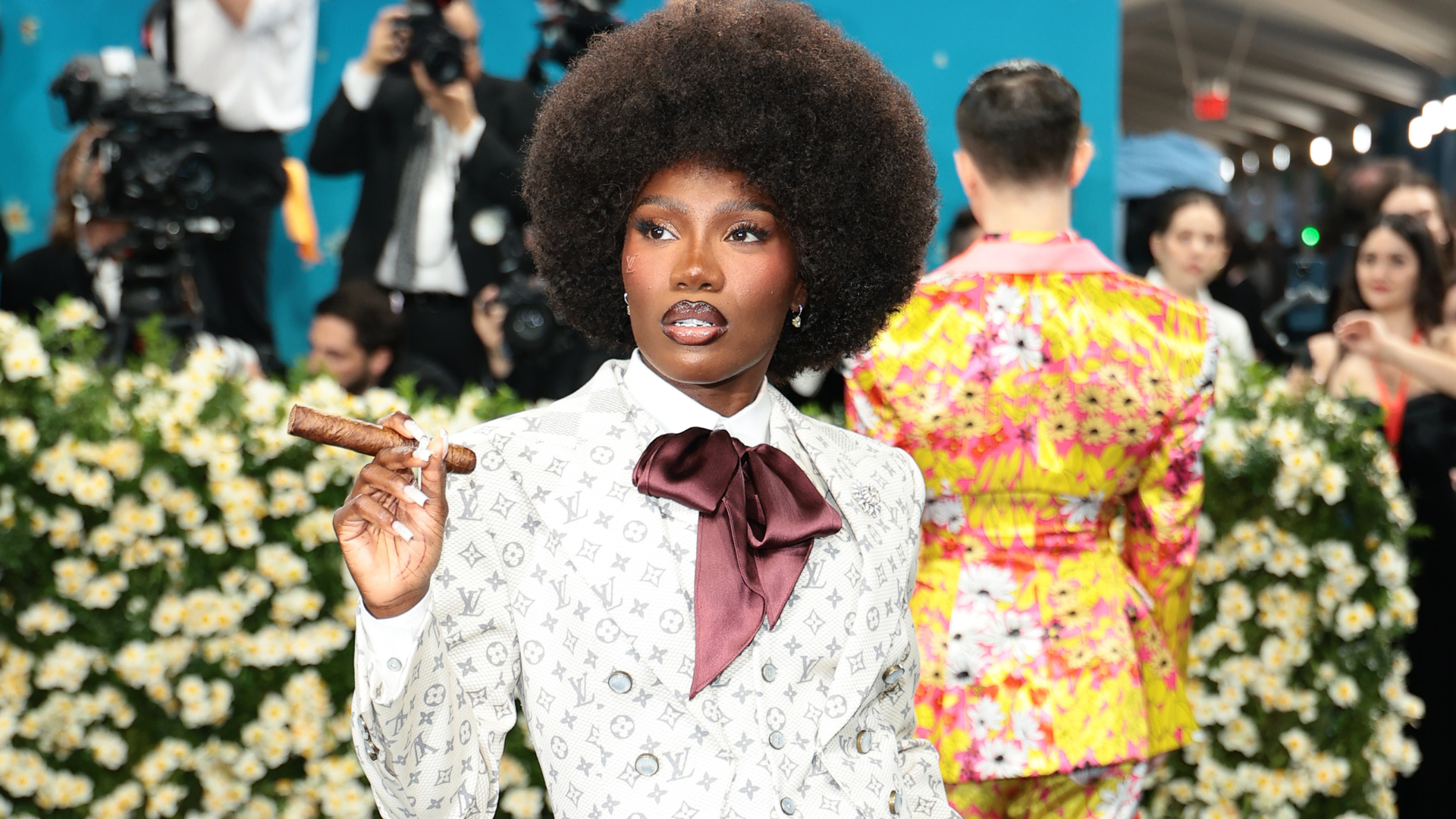 Grammy Award-winning rapper Doechii stepped onto the 2025 Met Gala blue carpet in a custom Louis Vuitton short suit, styled by her longtime stylist Sam Woolf. Moments before she arrived for her debut she was fully covered in a box by her team so that her unveiling would be a true surprise. She reportedly worked with Louis Vuitton, Woolf, and Pharrell Williams on the ensemble.